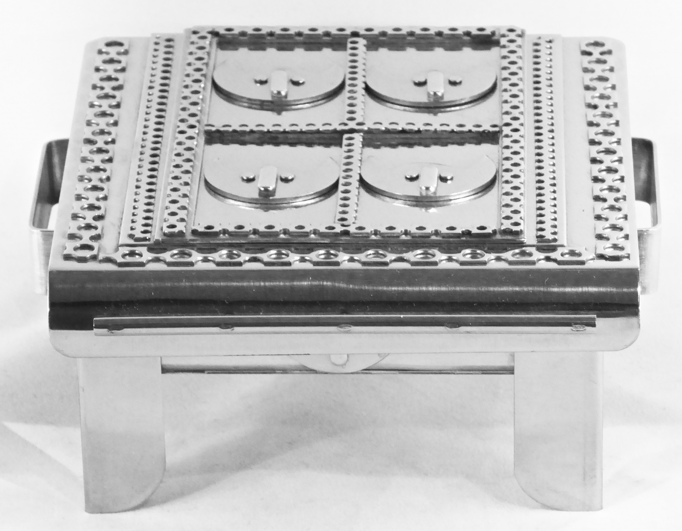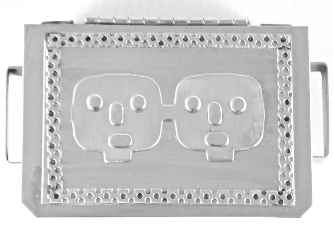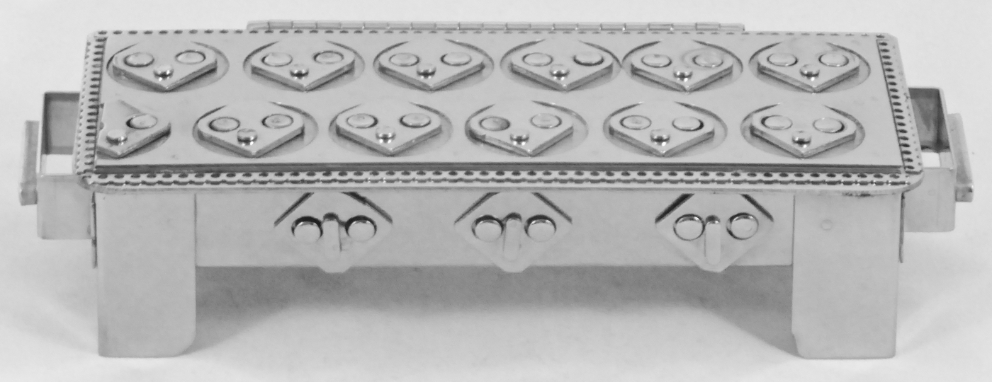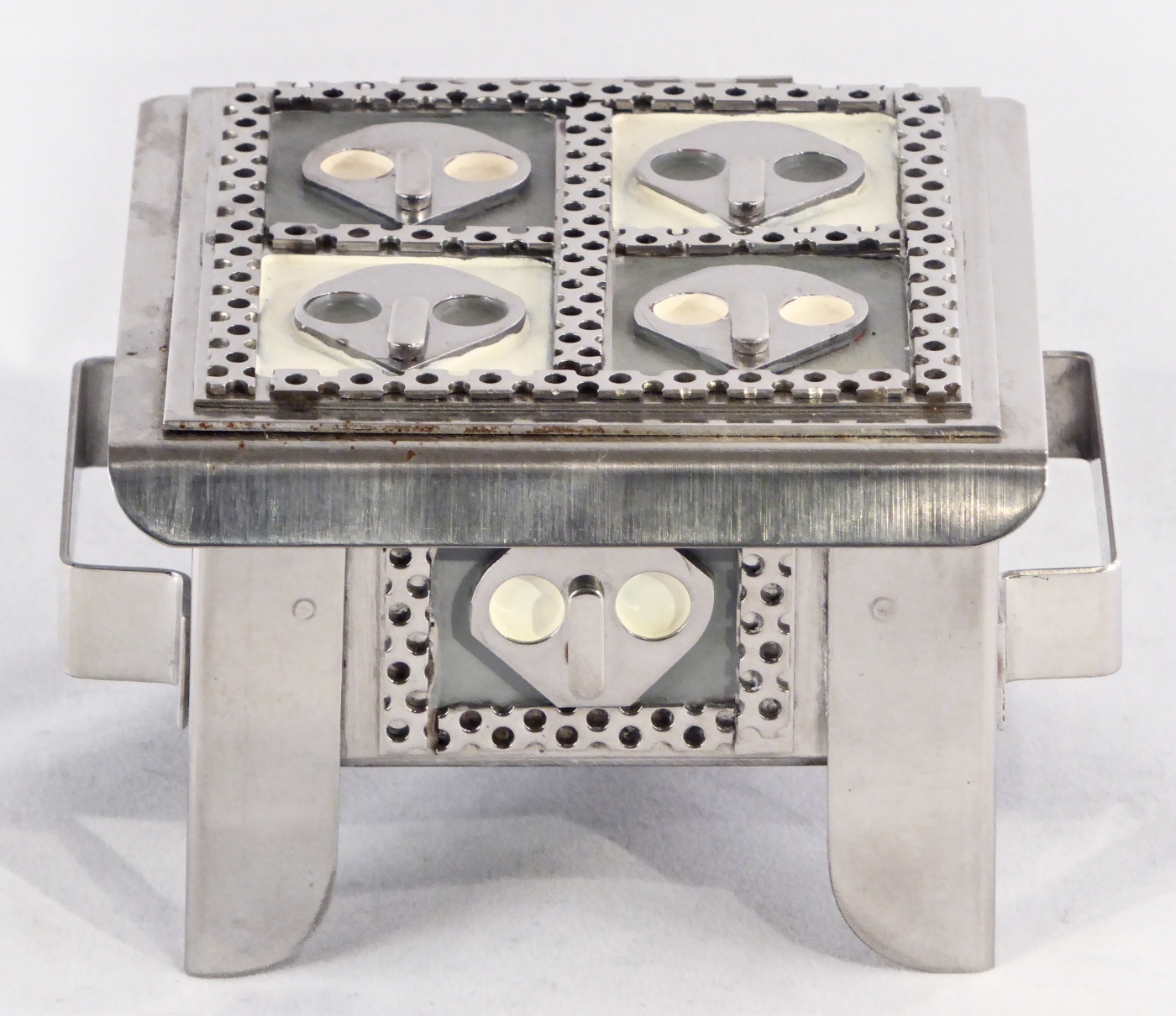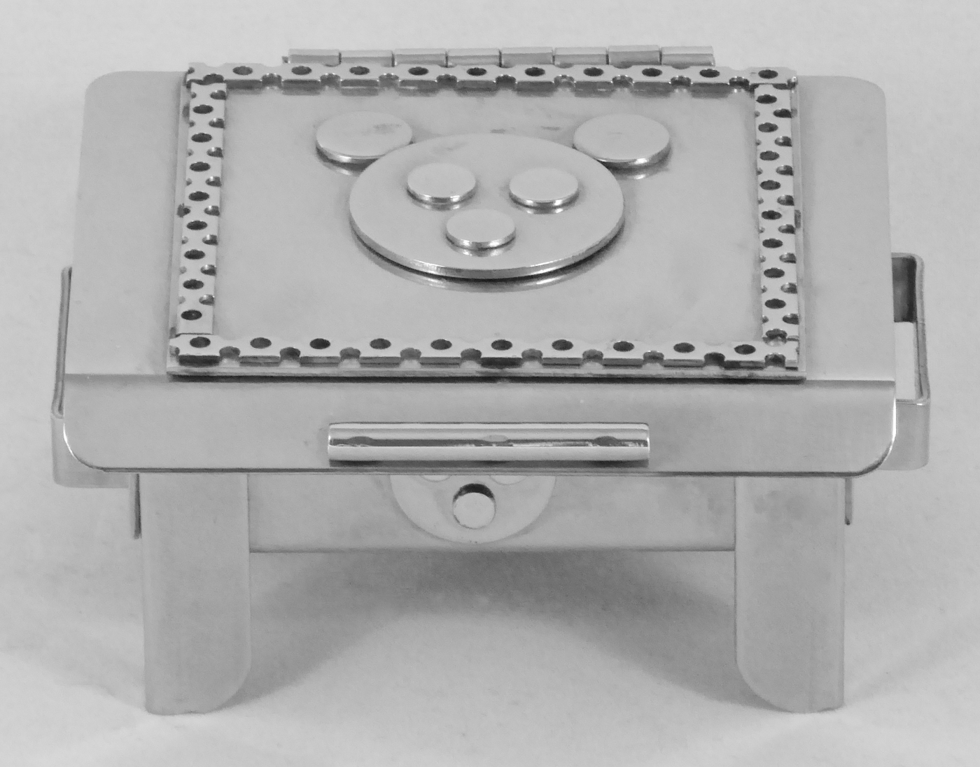 Stanley Szwarc’s most typical creations are marvels of decoration, stainless steel boxes lathered in abstract ornamentation. But he also applied his geometric talent to creating faces, some ominous, some cartoony, some robotic, and some quite dressy. When the book keeper turned metal worker took up representational imagery, his imagination was stunning.