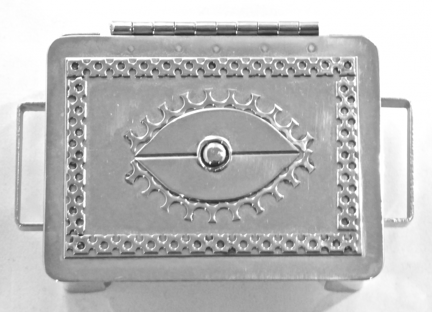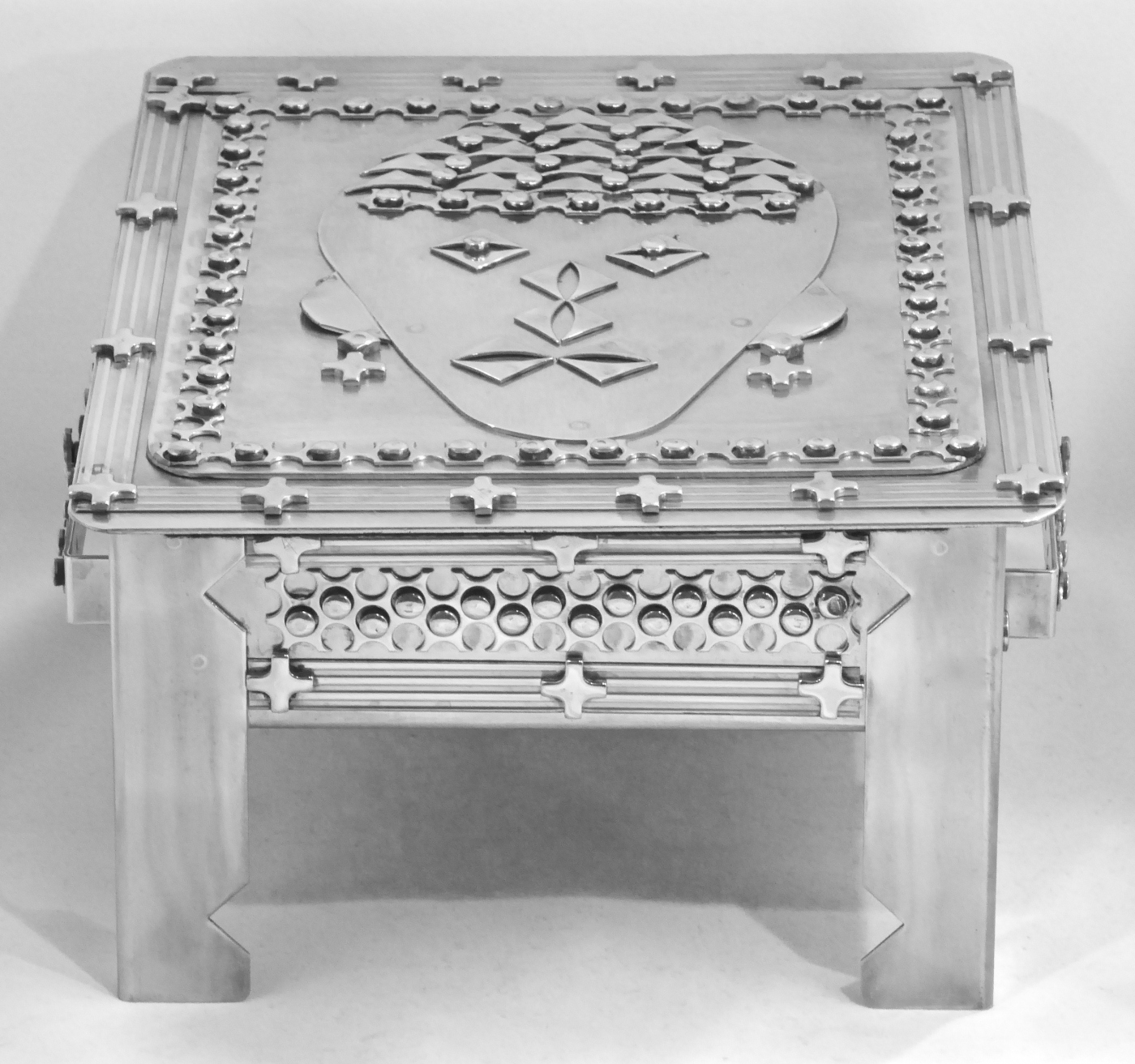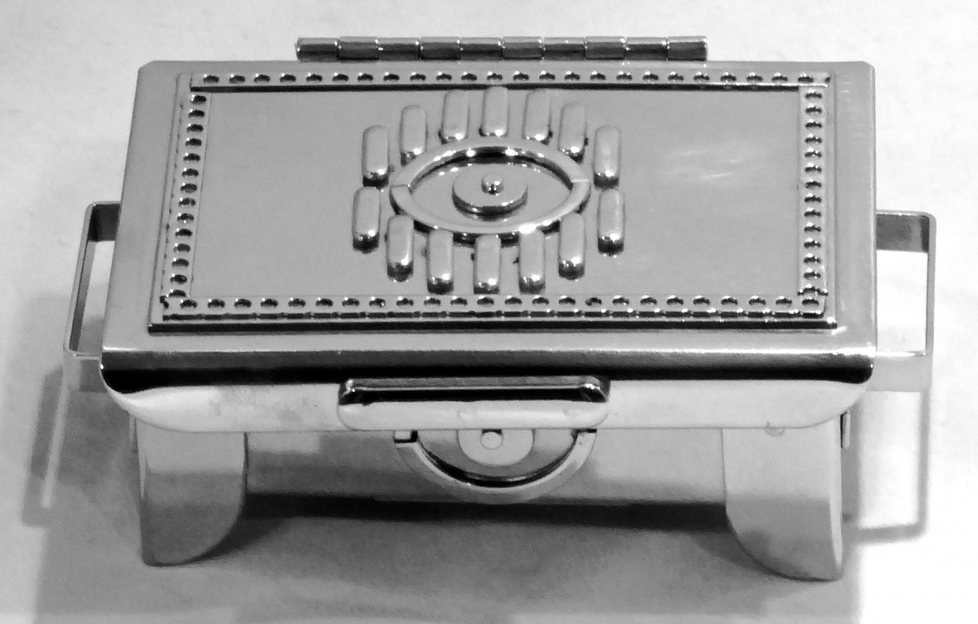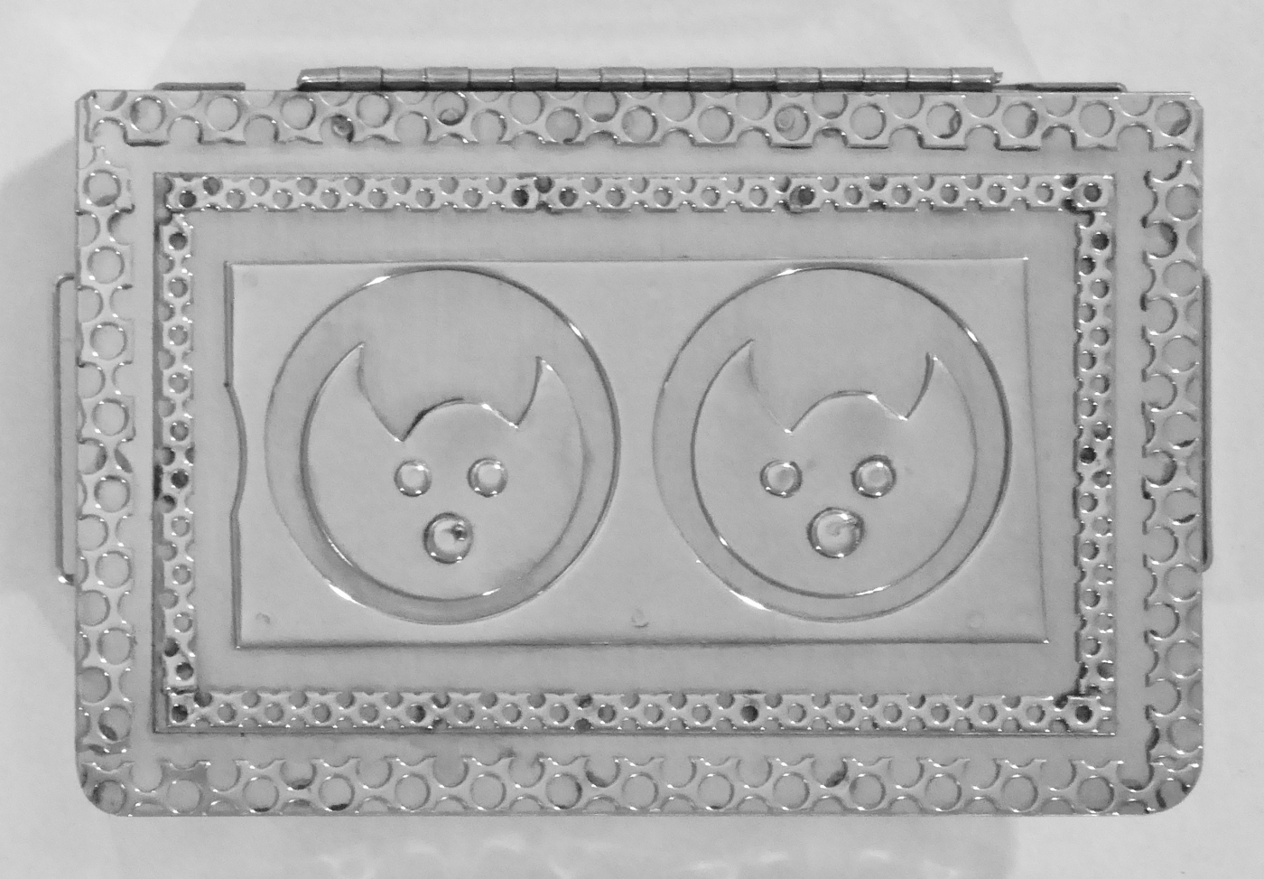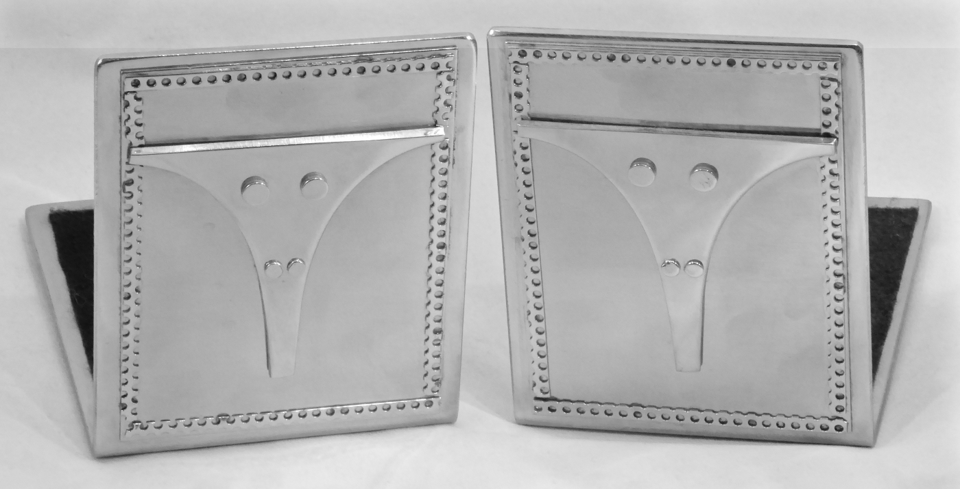 Stanley Szwarc’s most typical creations are marvels of decoration, stainless steel boxes lathered in abstract ornamentation. But he also applied his geometric talent to creating faces, some ominous, some cartoony, some robotic, and some quite dressy. When the book keeper turned metal worker took up representational imagery, his imagination was stunning.