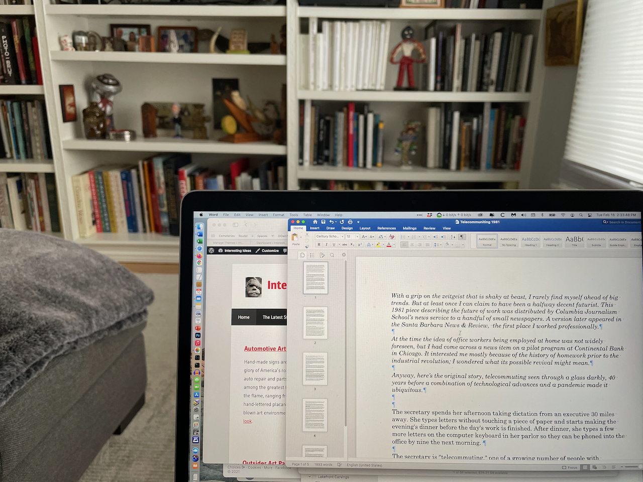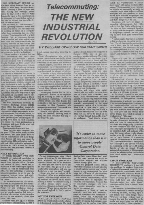 At the time the idea of office workers being employed at home was not widely foreseen, but I had come across a news item on a pilot program at Continental Bank in Chicago. It interested me mostly because of the history of homework prior to the industrial revolution; I wondered what its possible revival would mean in a modern economy.