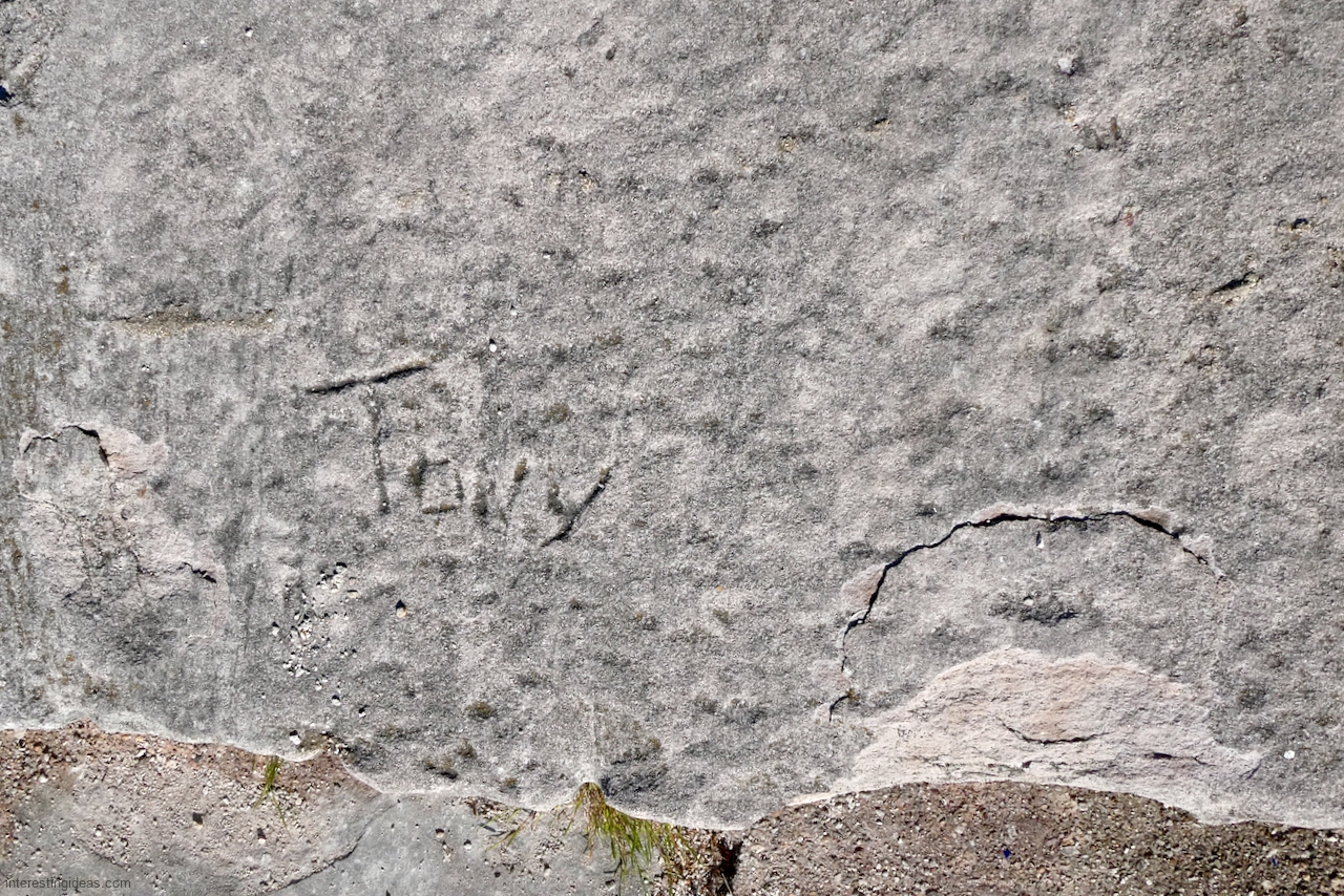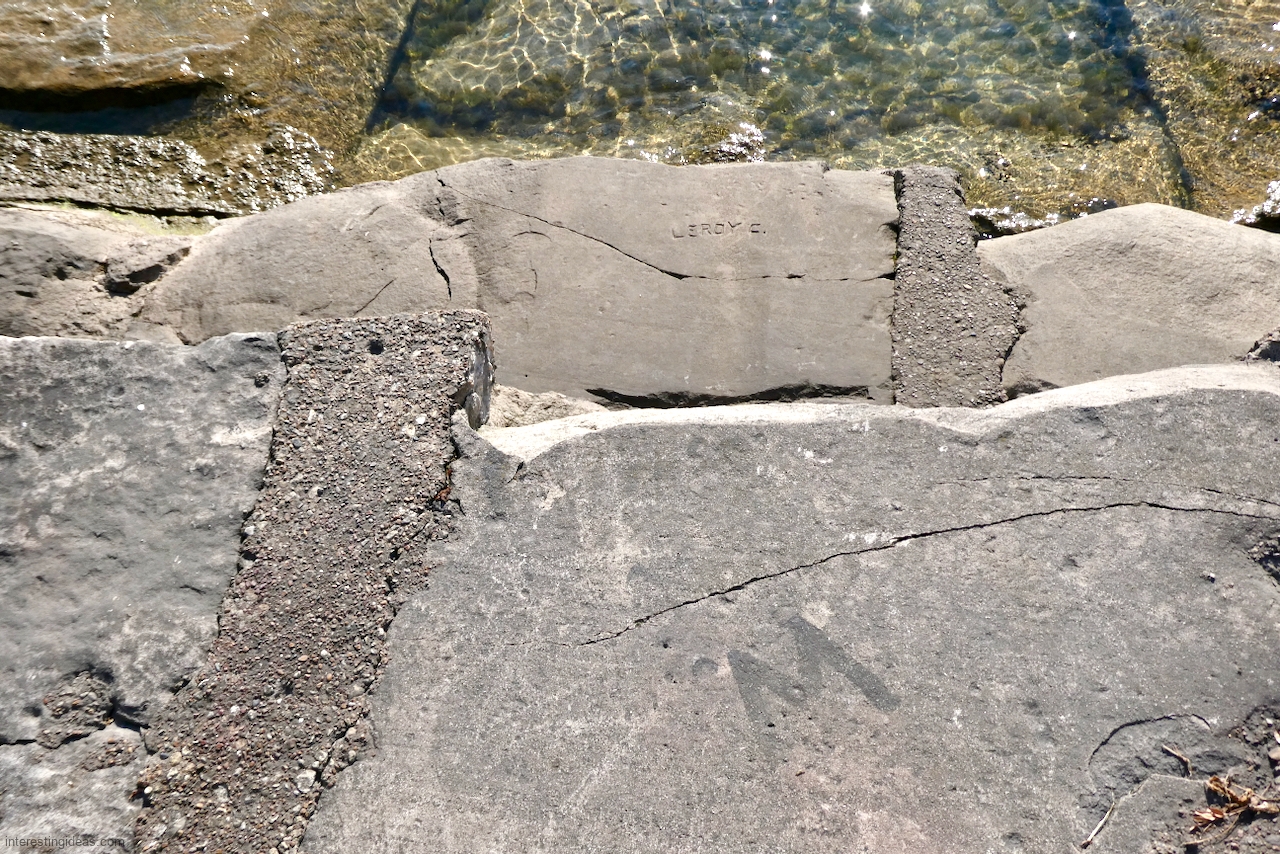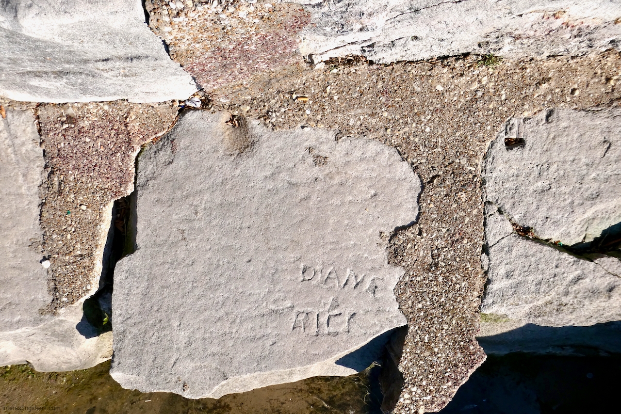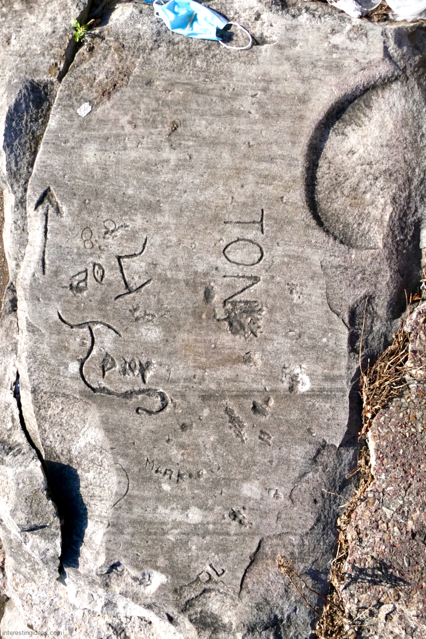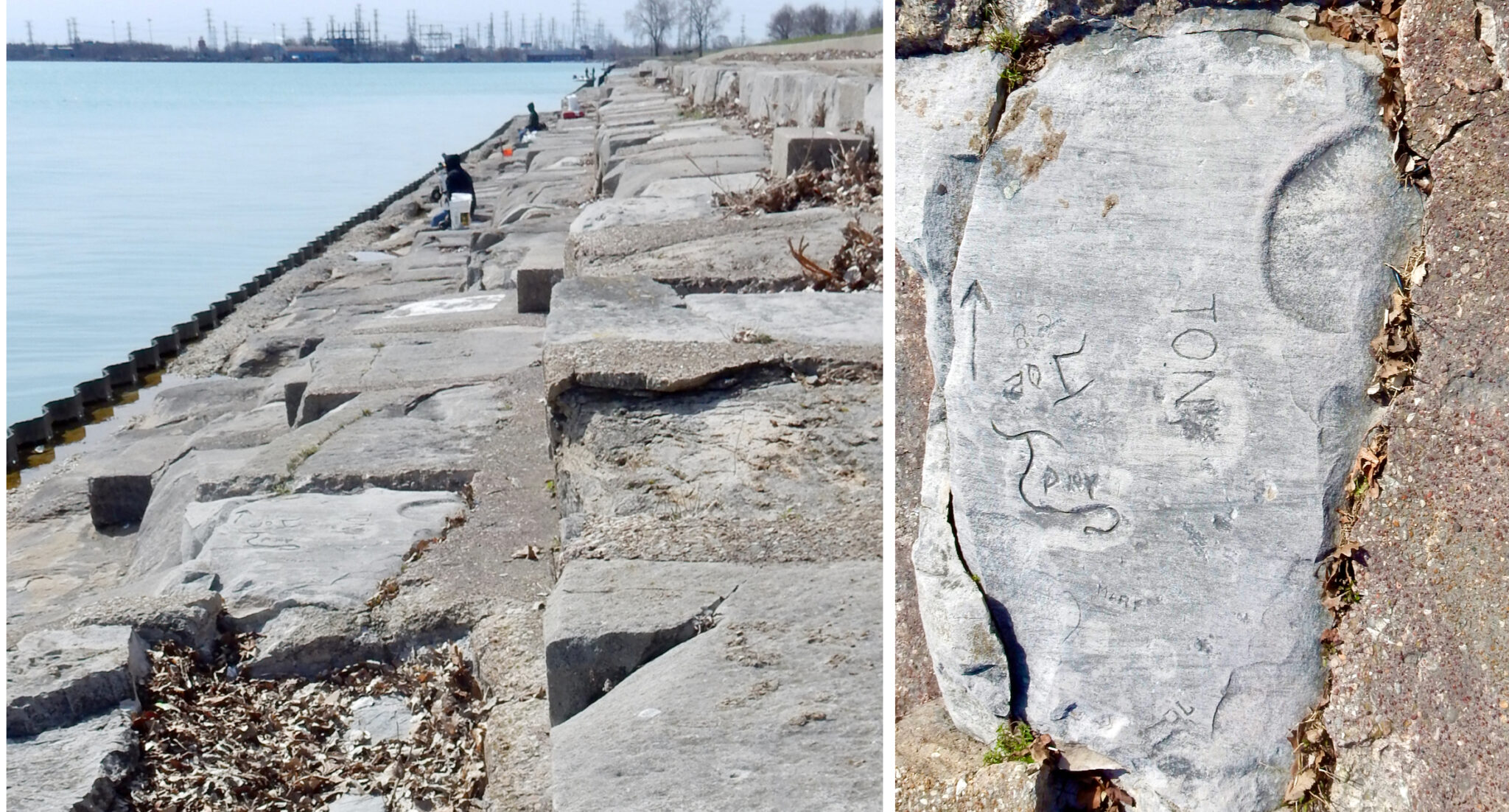 Another factor is the high volume of what I call autograph rocks — blocks where many people, sometimes dozens, have each carved their names. These exist all up and down the lakefront but are especially plentiful near the Calumet Park Coast Guard station.