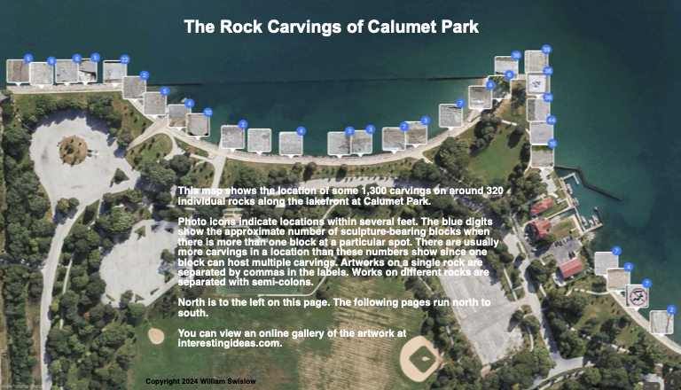 Click the map image below to download finder maps for The Calumet Park carvings. They are printable and also interactive. Clicking on a carving in the pdf will link to a photo of that carving. Below the map is a sequential galleries of the most interesting carvings, running north to south.