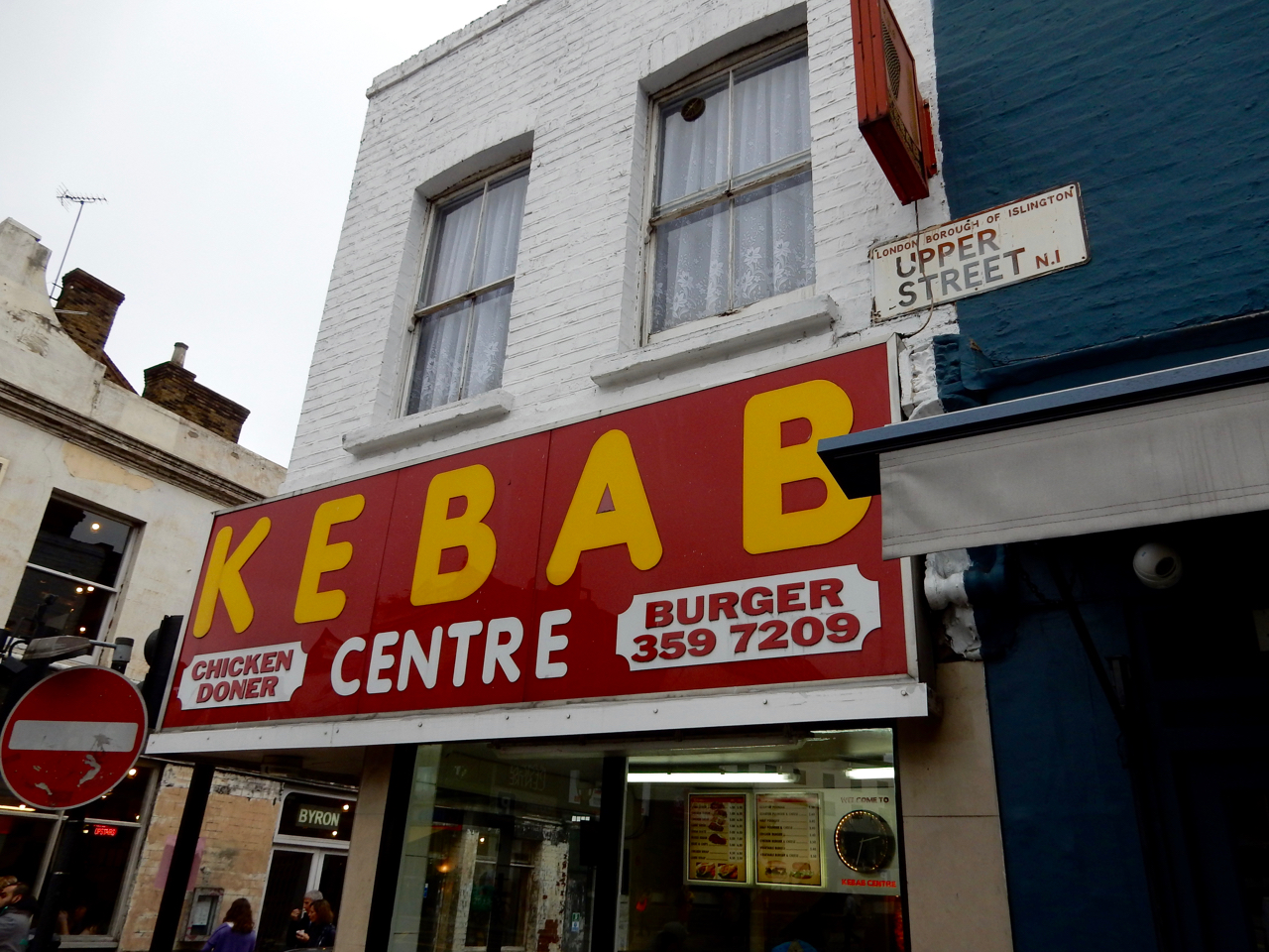 The painter of this sign for the Kebab Centre, Camden Passage, London, was not concerned with rendering a realistic gyros but rather embellishing it with grillwork-style details. Unique among the 500-plus images in The Gyros Project.