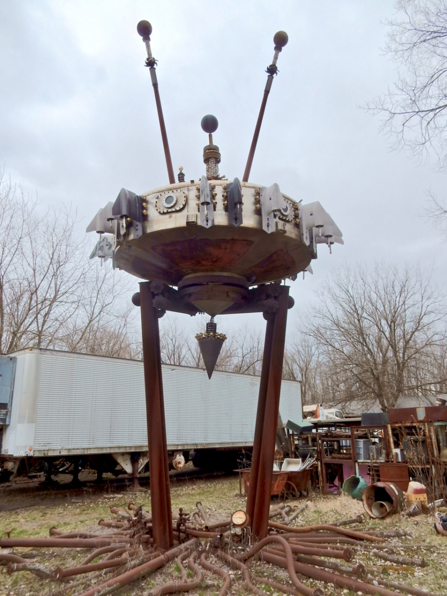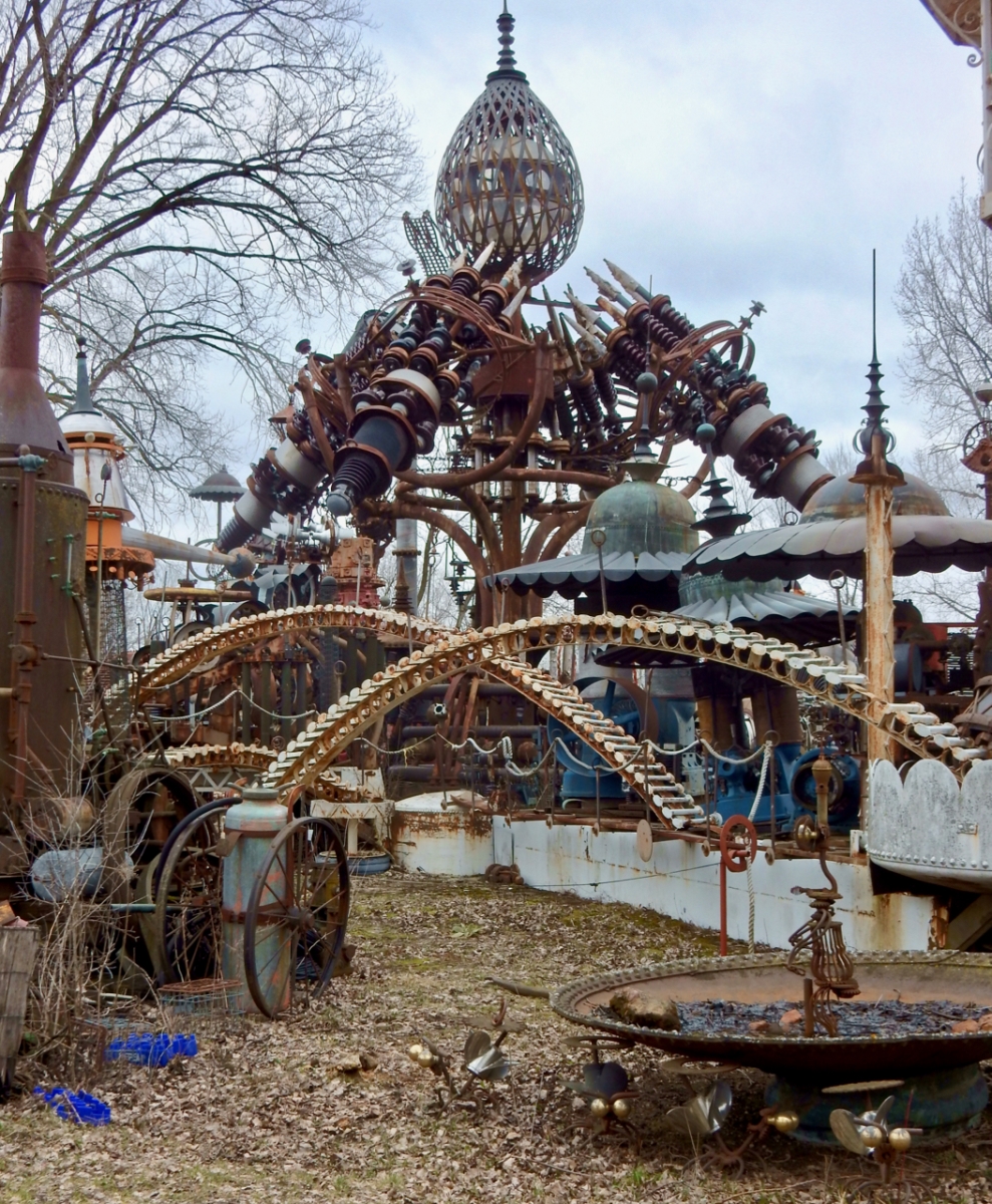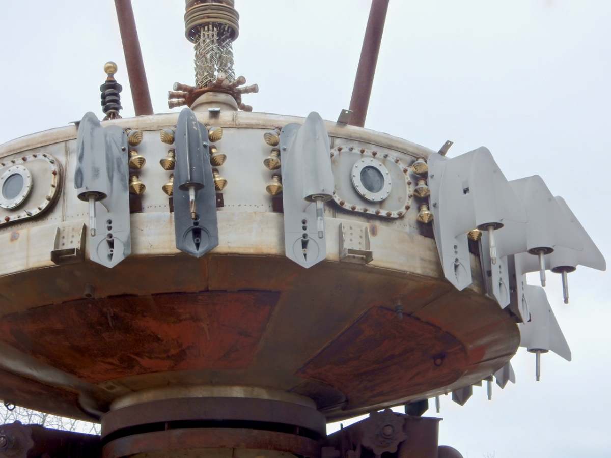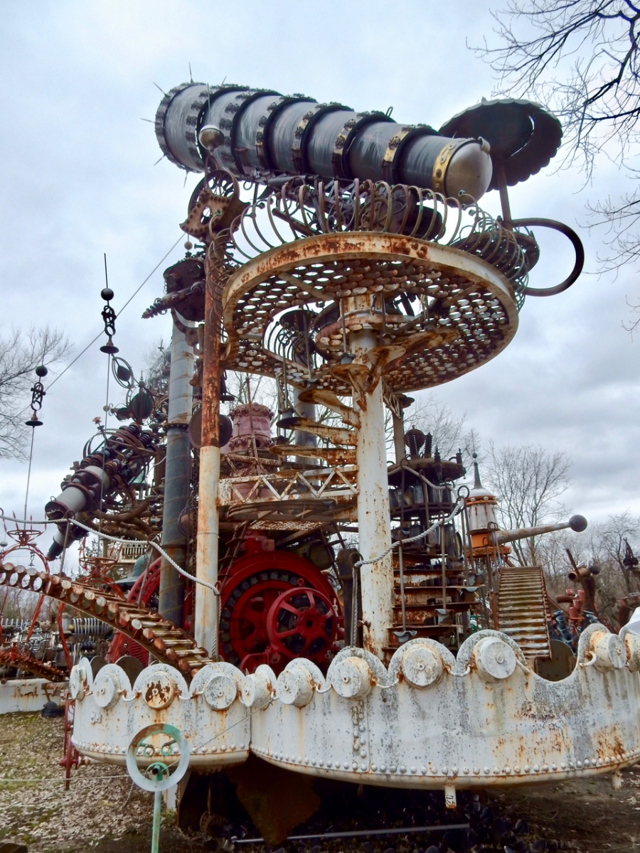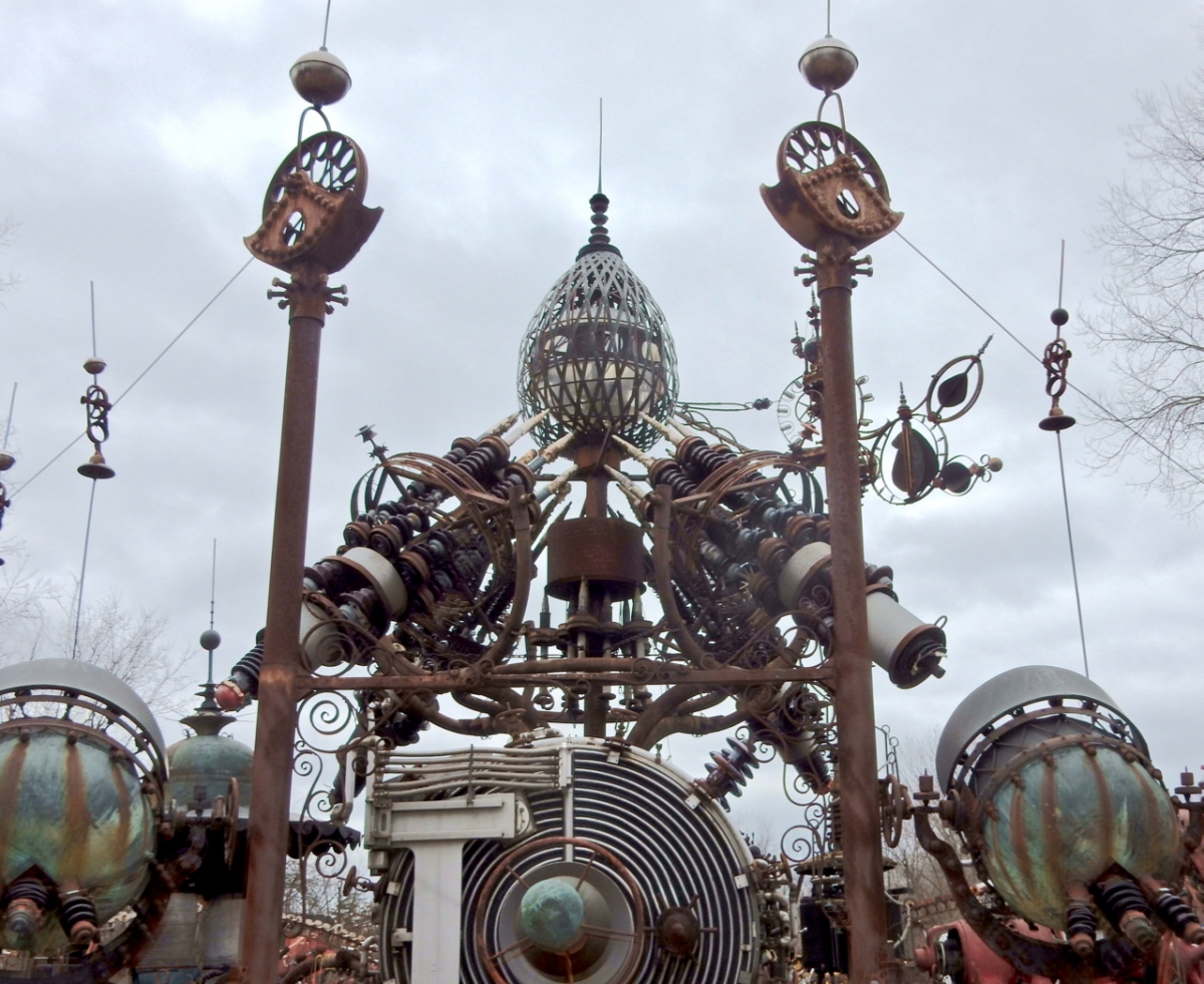 The Forevertron is a steampunk paradise, with a Victorian look in service of science-fiction vision. Creator Tom Every, born in 1938, has experience as a farmhand, salvager, construction worker and architect’s assistant, according to Leslie Umberger’s Sublime Spaces and Visionary Worlds catalog. Every also helped to fabricate attractions at The House on the Rock, Wisconsin’s foremost tourist trap and a whole other story.