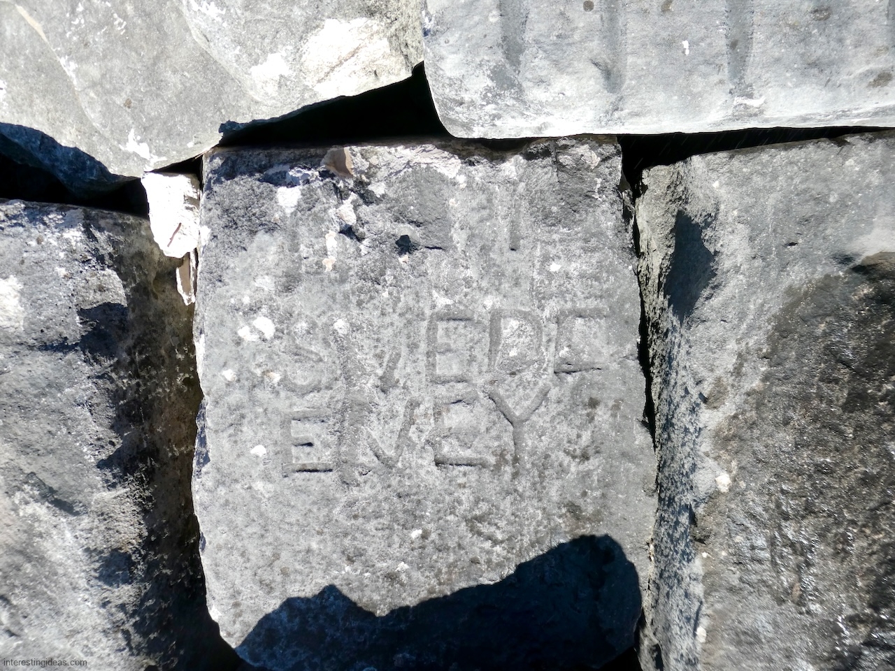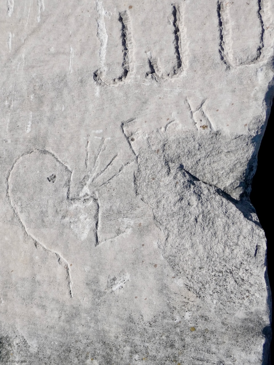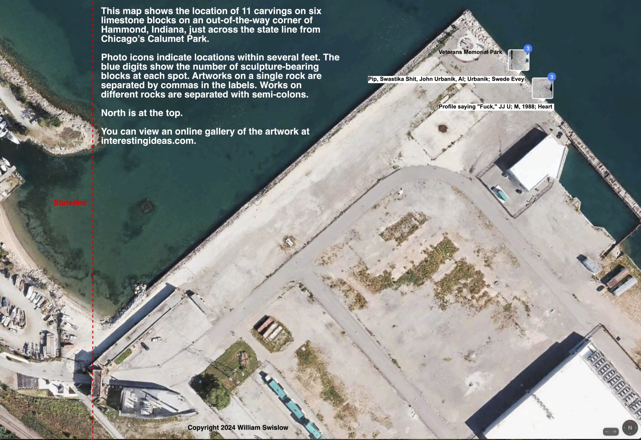 An out-of-the-way corner of Hammond, Indiana, hosts 12 straggling carvings on six limestone blocks that line the lakefront just south of Chicago’s Calumet Park, which itself boasts nearly 1,500 carvings. Access to the carvings, adjacent to Veteran’s Memorial Park, is through an archway that belonged to the NIPSCO power plant once located here.