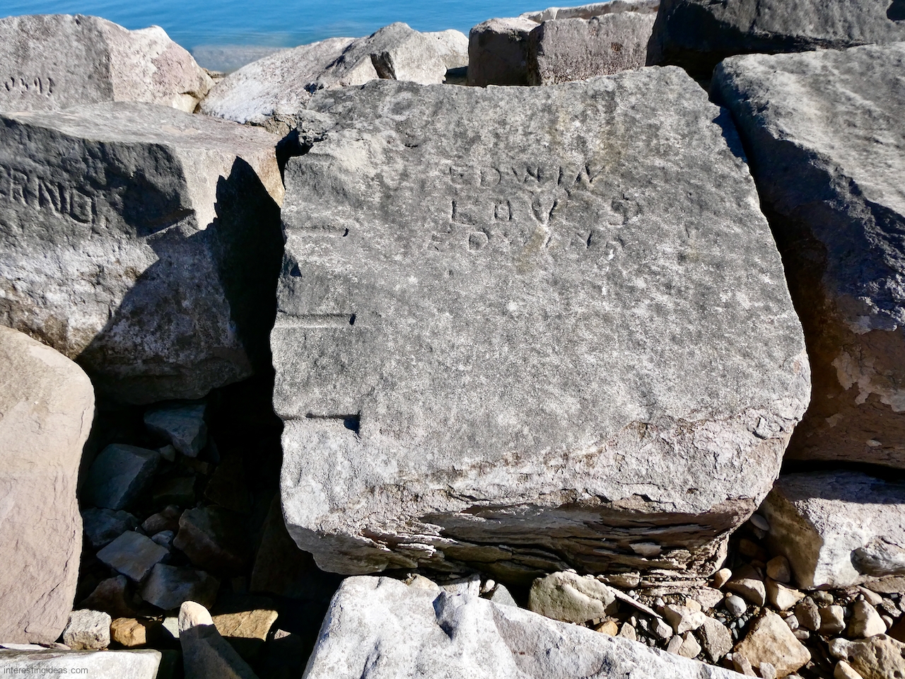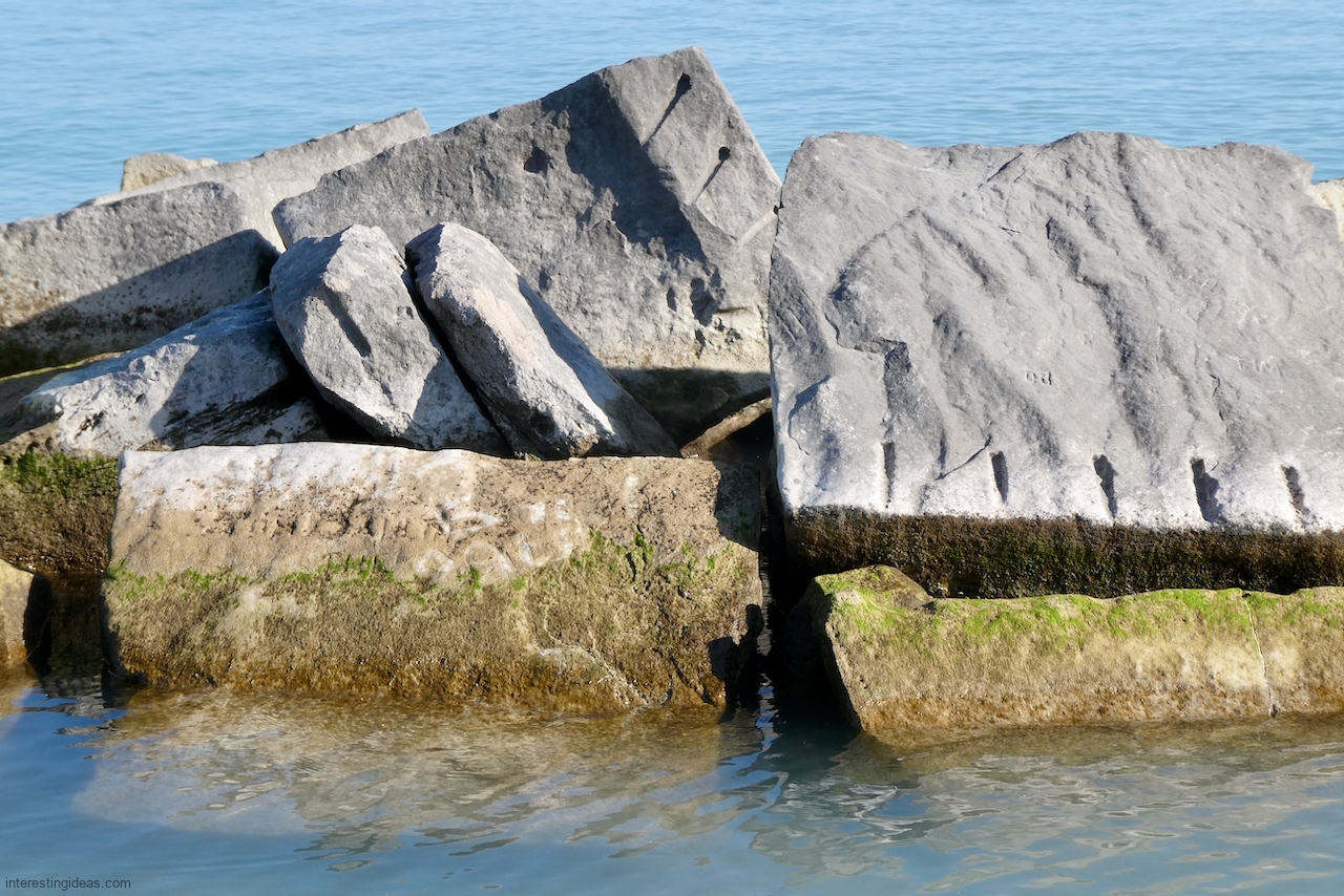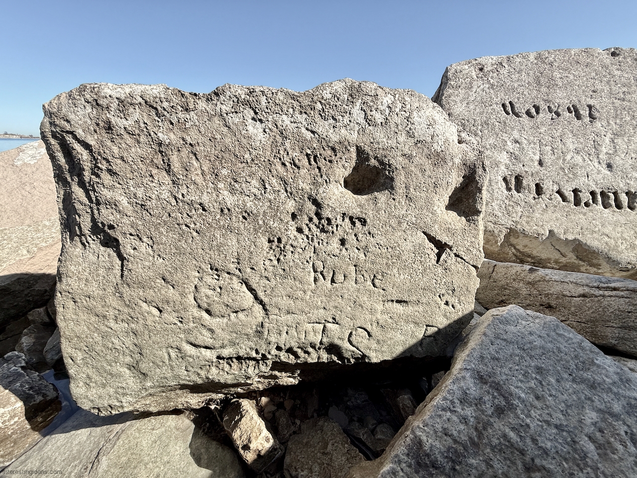 Several of the Chicago lakefront’s most magnificent rock carvings reside on the stones south of La Rabida Hospital near 65th Street and the lake. For the last several years many of these carvings were inaccessible or invisible under the water. But with the lake’s level having fallen in the last few years they are now mostly visible (as of spring 2025). These 200 or so carvings, I believe, are the last large group that remained to be documented as part of my Lakefront Anonymous project. Here are highlights from this group.