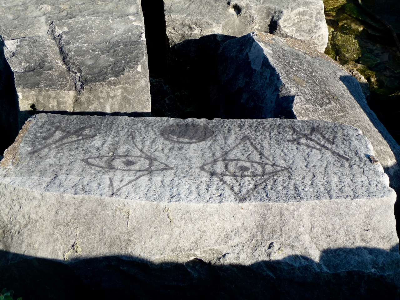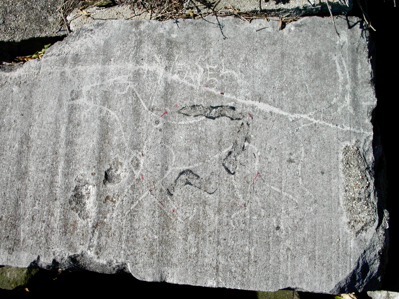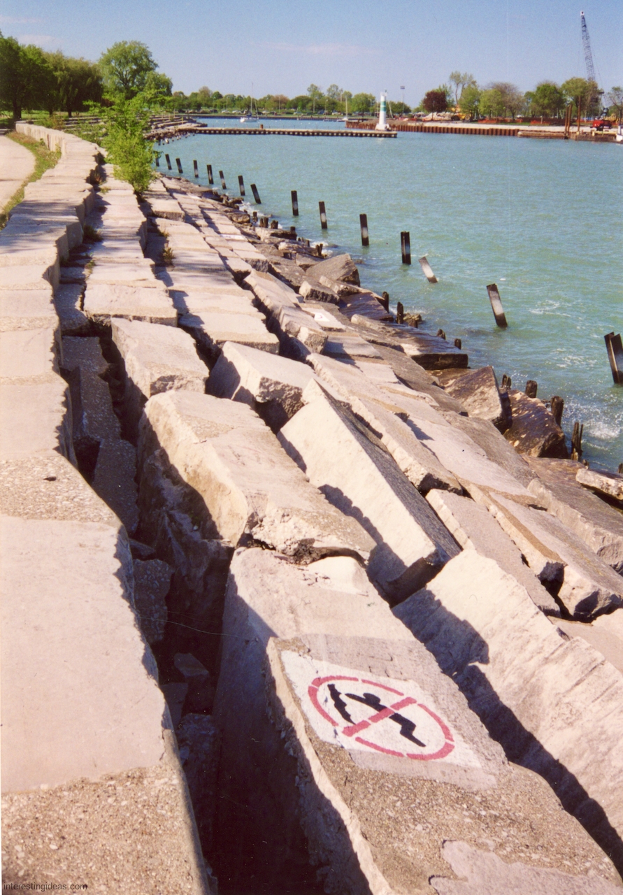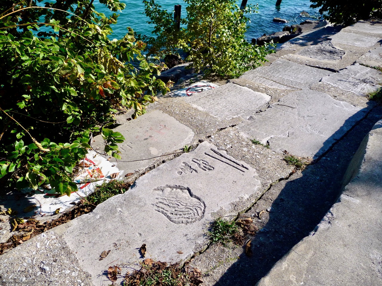 Carvings on the blocks that lined the waterfront south of Montrose Harbor lasted a bit longer before they too were demolished — indeed, a few have survived on the one stretch of undisturbed shore immediately opposite the entrance to the harbor.