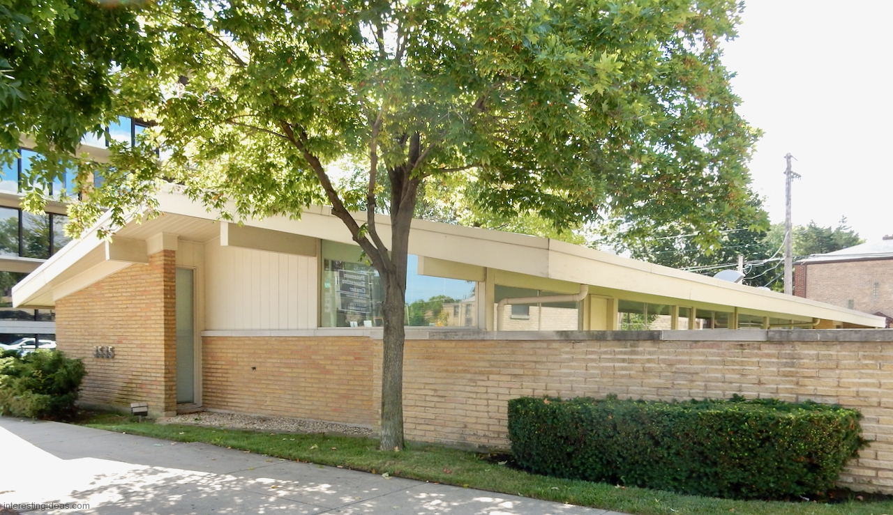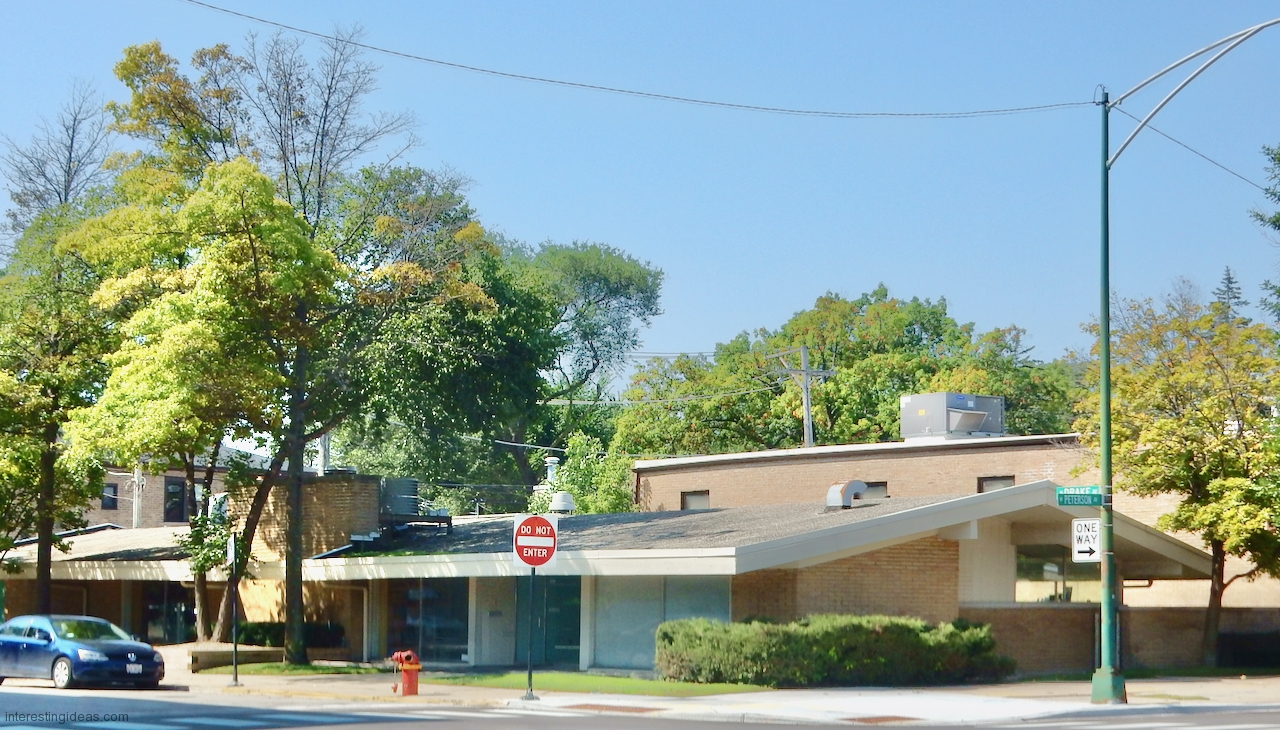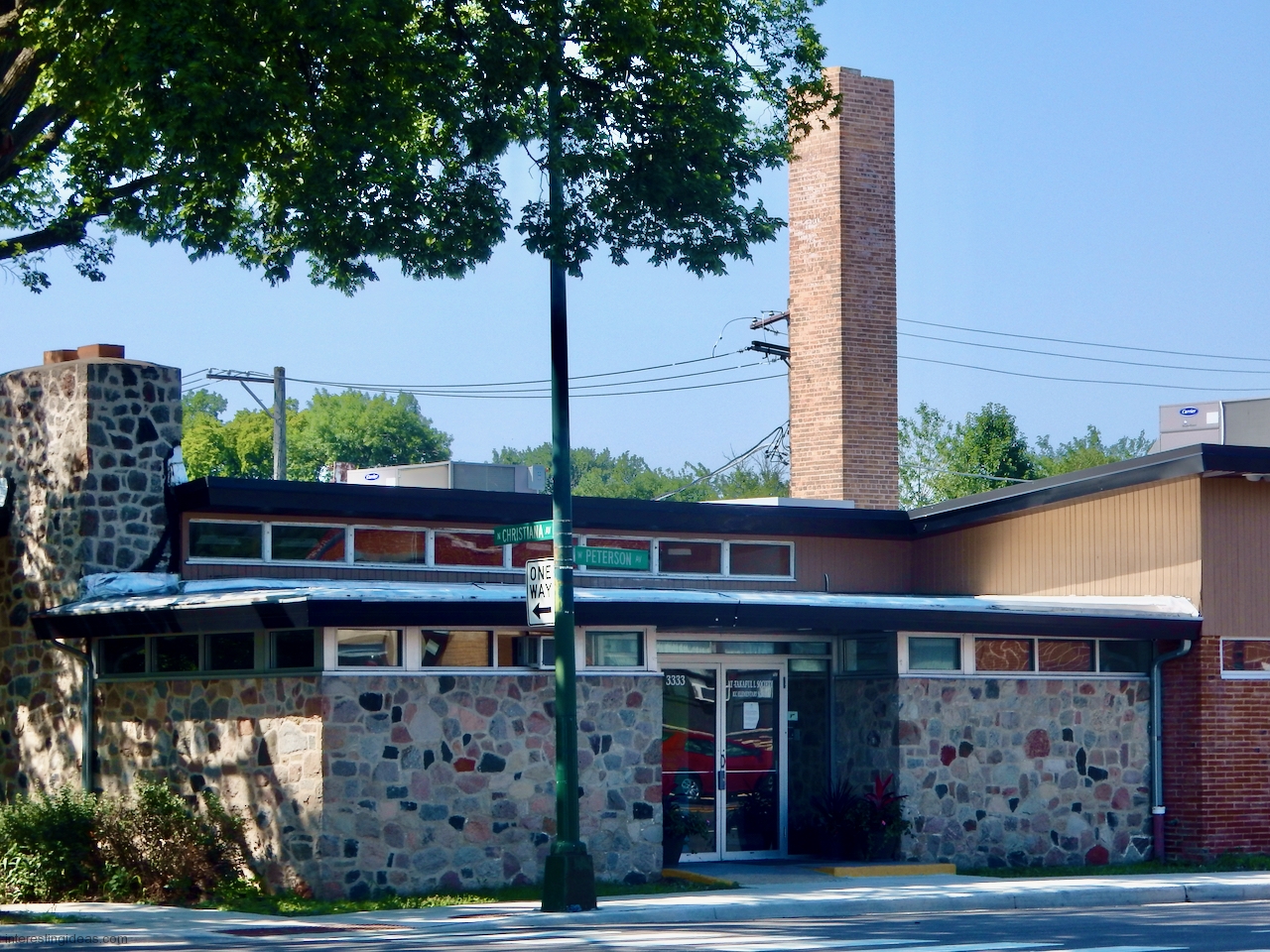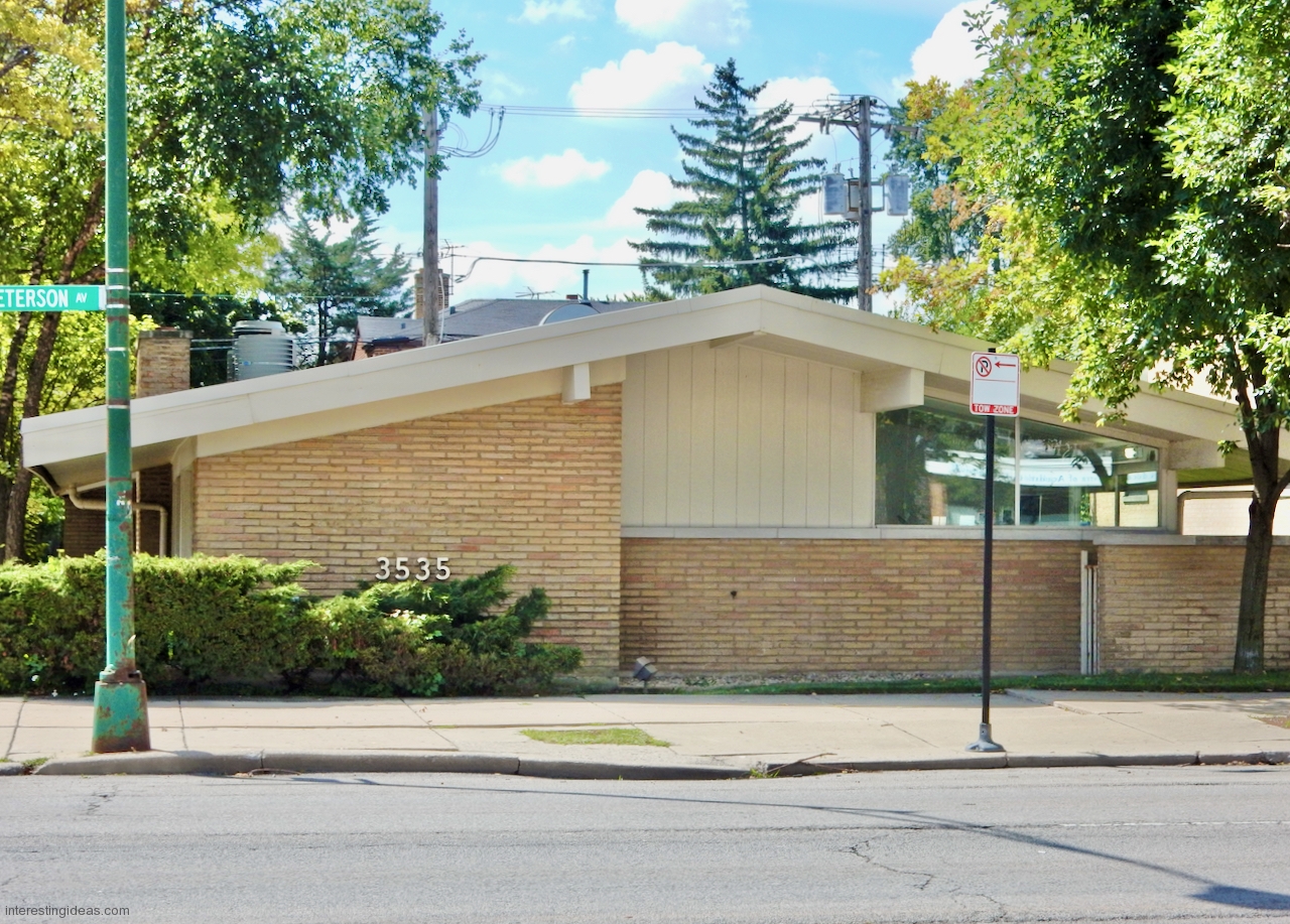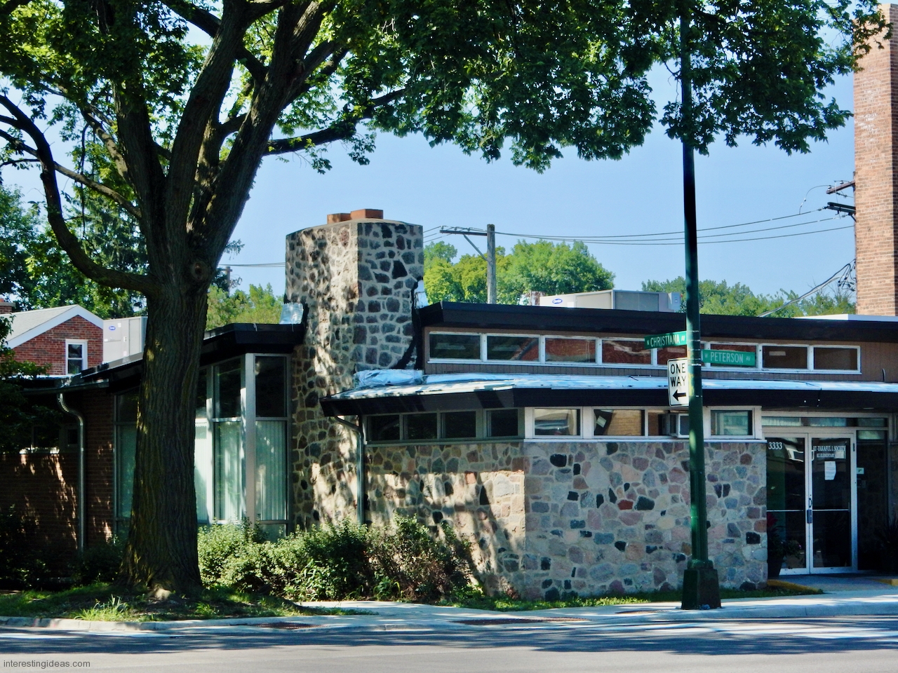Peterson Avenue: A cynic might say it’s where Prairie style went to die, and I’d say, yes and an honorable death. The mid-century buildings on this commercial strip range from late moderne to proto-post modern, with lots of typical Mid Century Modern buildings in between, all showing a range of Prairie influences.