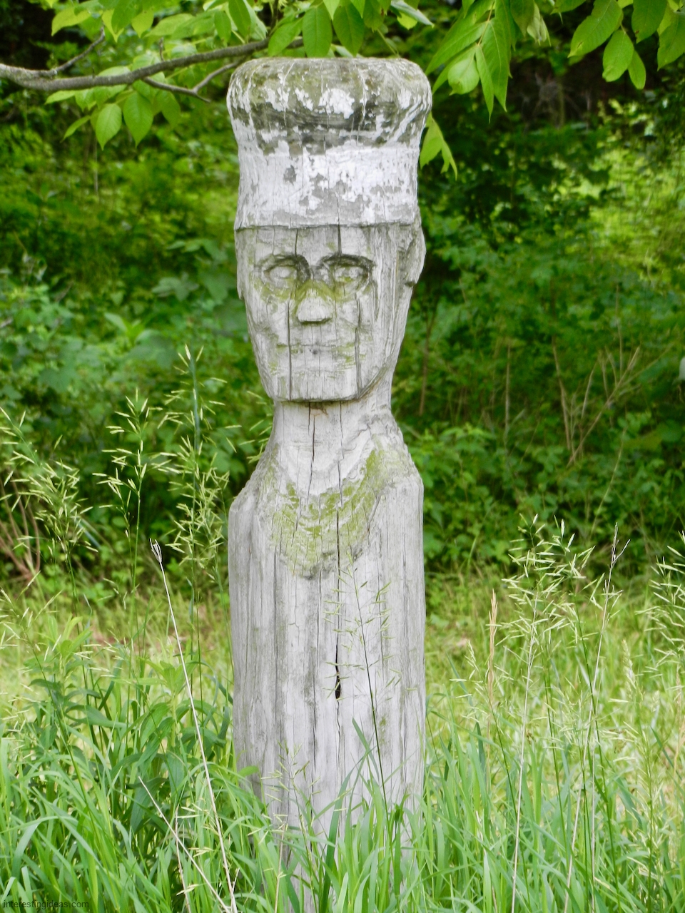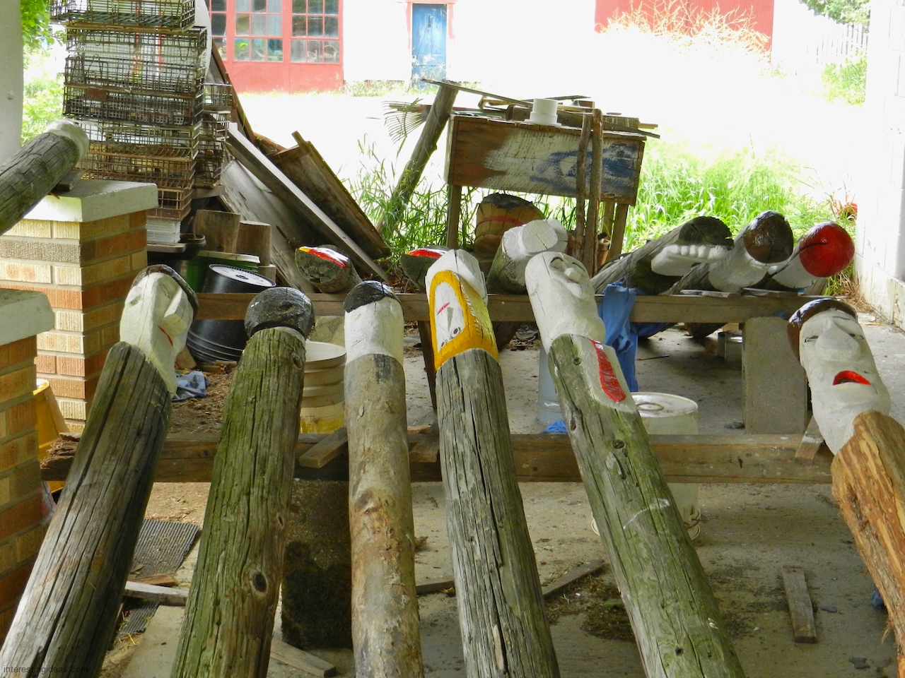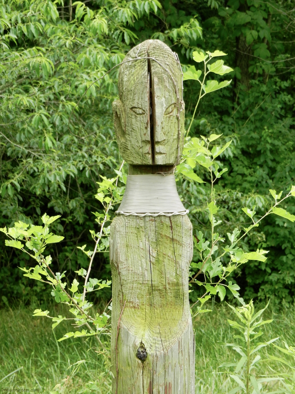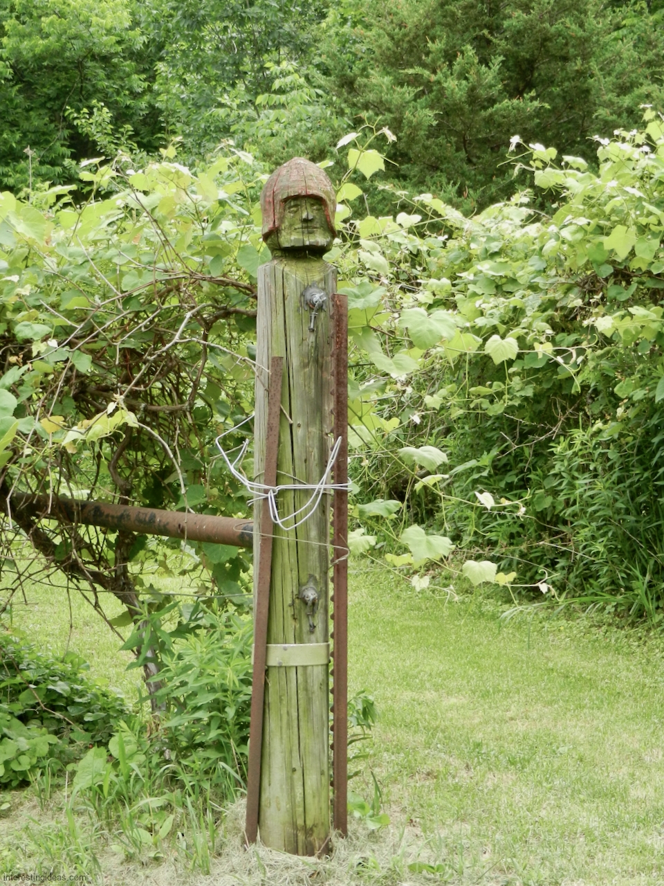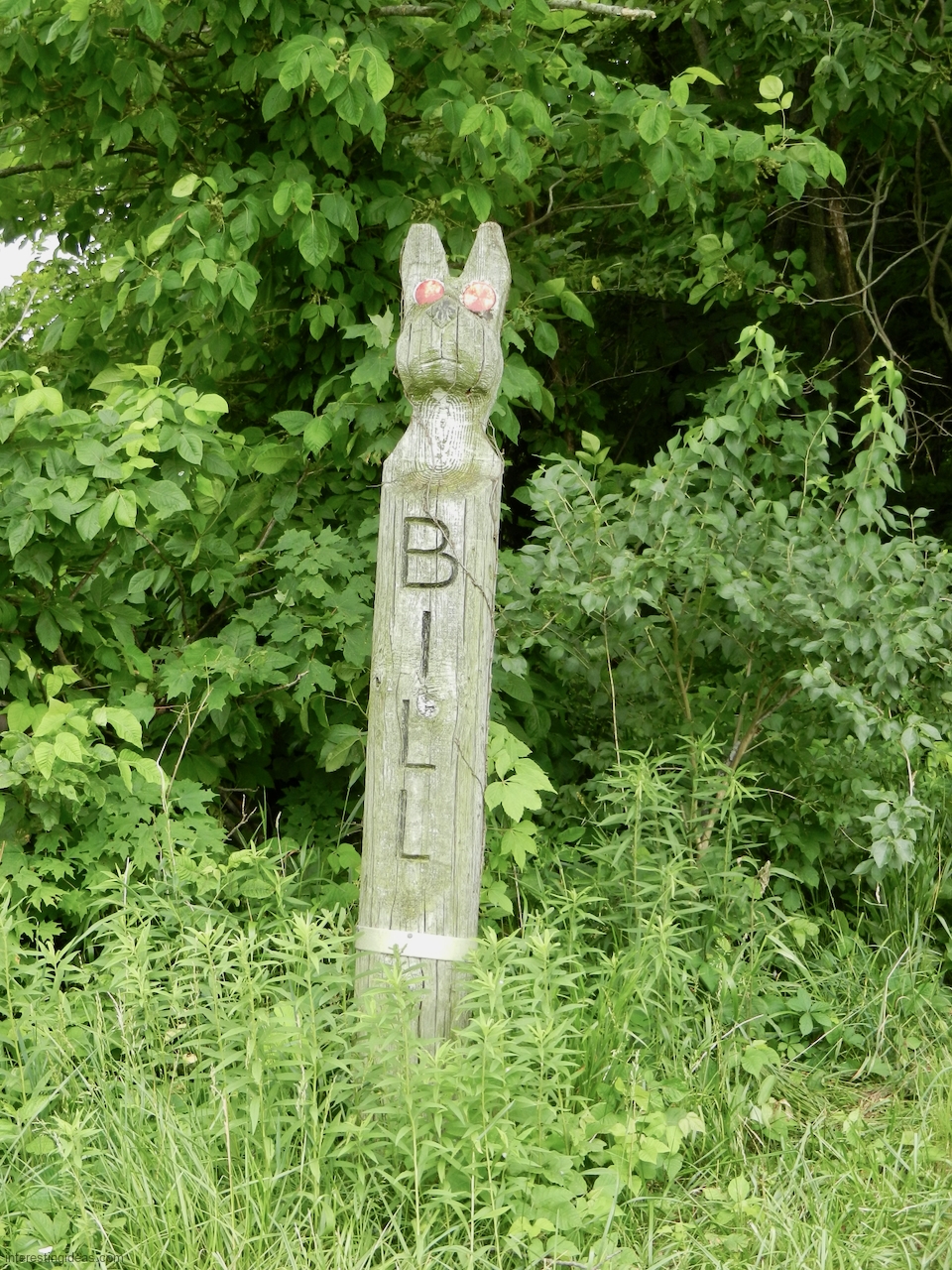 D Bill, who preferred an initial to his full name Darwin, mostly sold his work at the annual Sugar Creek Arts Festival in the nicely named Normal, Illinois. But he also used it to decorate his spread in Danvers, a few miles west. The poles were scattered around his house and workshop and lined the long driveway up to his rural property. Some were tipped with animals, some human faces, some prosaic objects like a key or a telephone.