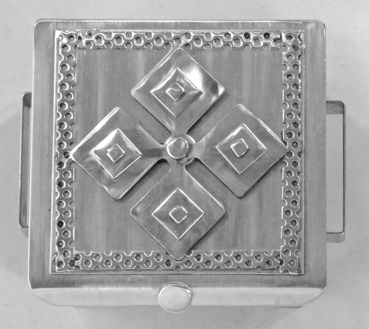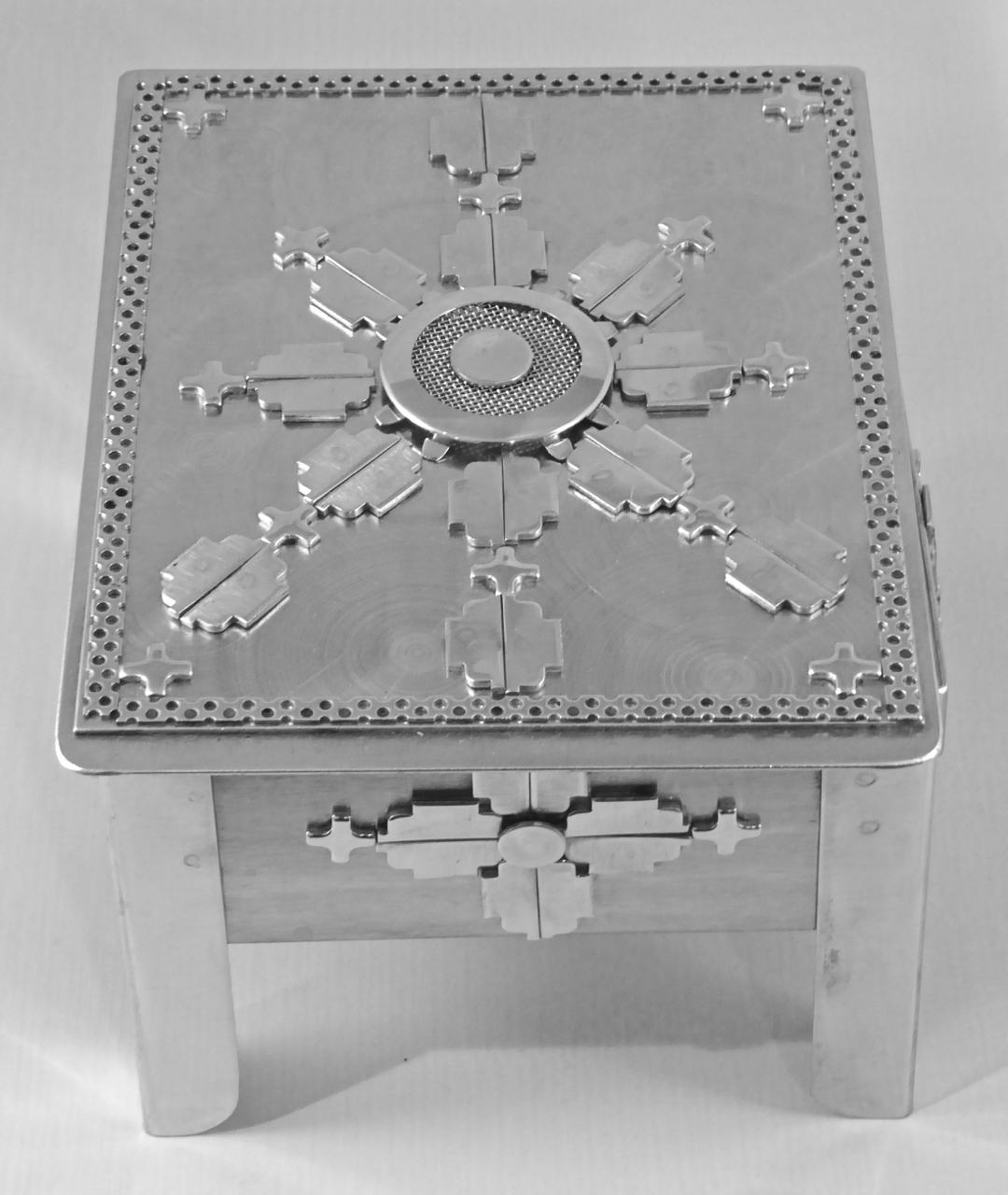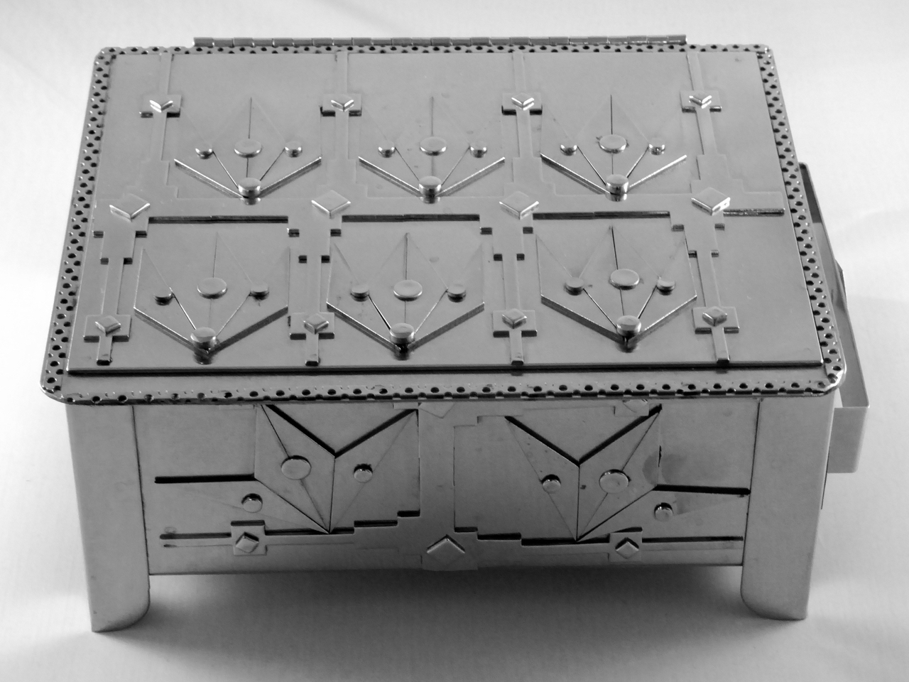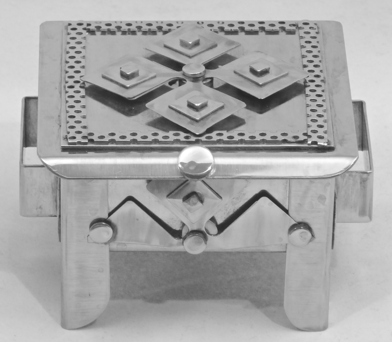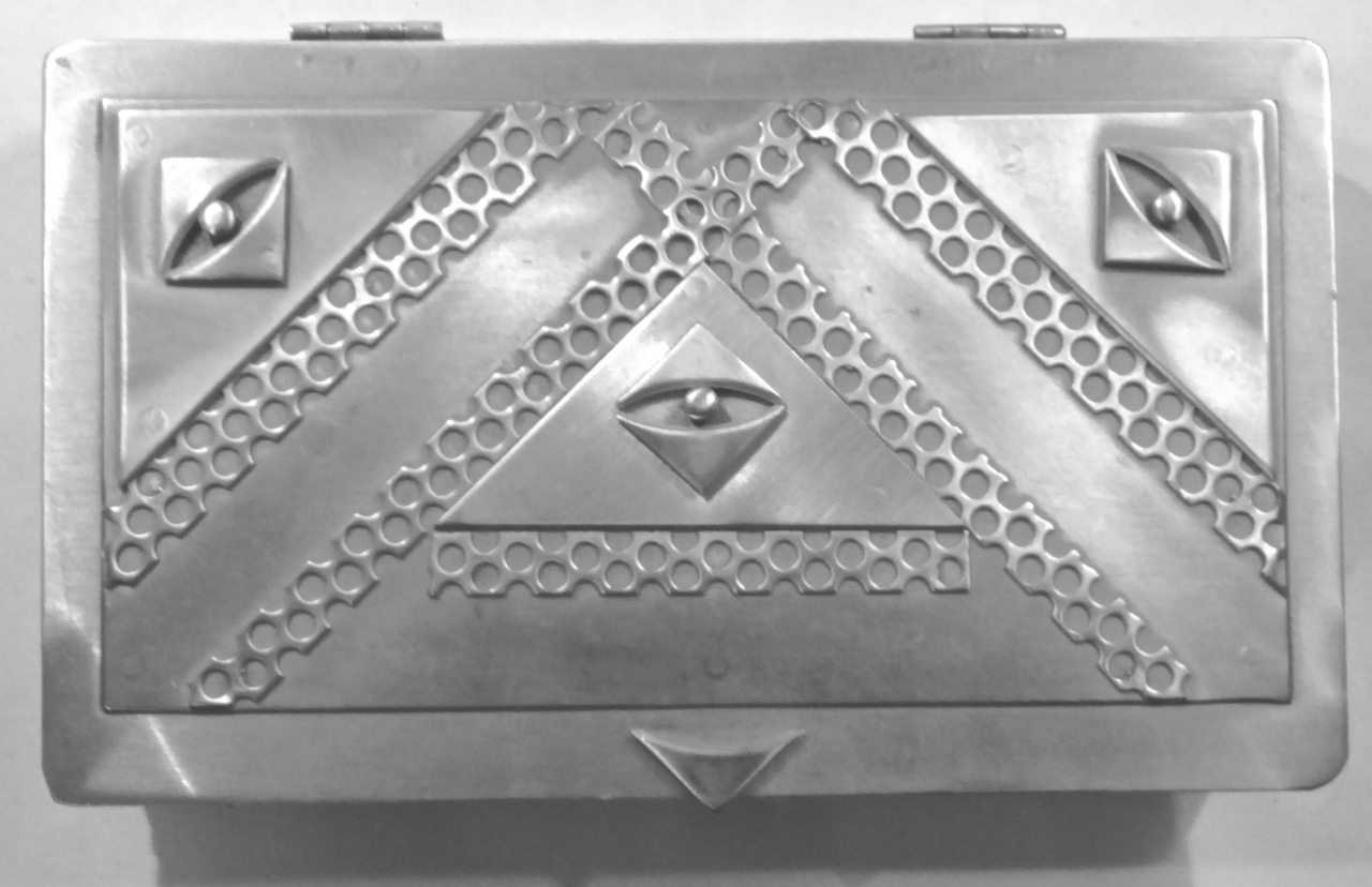 Stanley Szwarc (1928-2011) was a prolific artist, and boxes were his most frequent creation. There are thousands of these floating around the Chicago area, ranging from tiny ones barely a couple of inches wide to bruisers that could take up the corner of a desk. In his basement were closets and trunks filled with layers of boxes stacked up and divided by sheets of cardboard. “No two alike,” he would always say. As with all his work, the ornamentation is brilliantly creative.