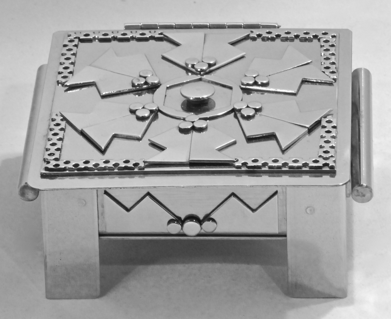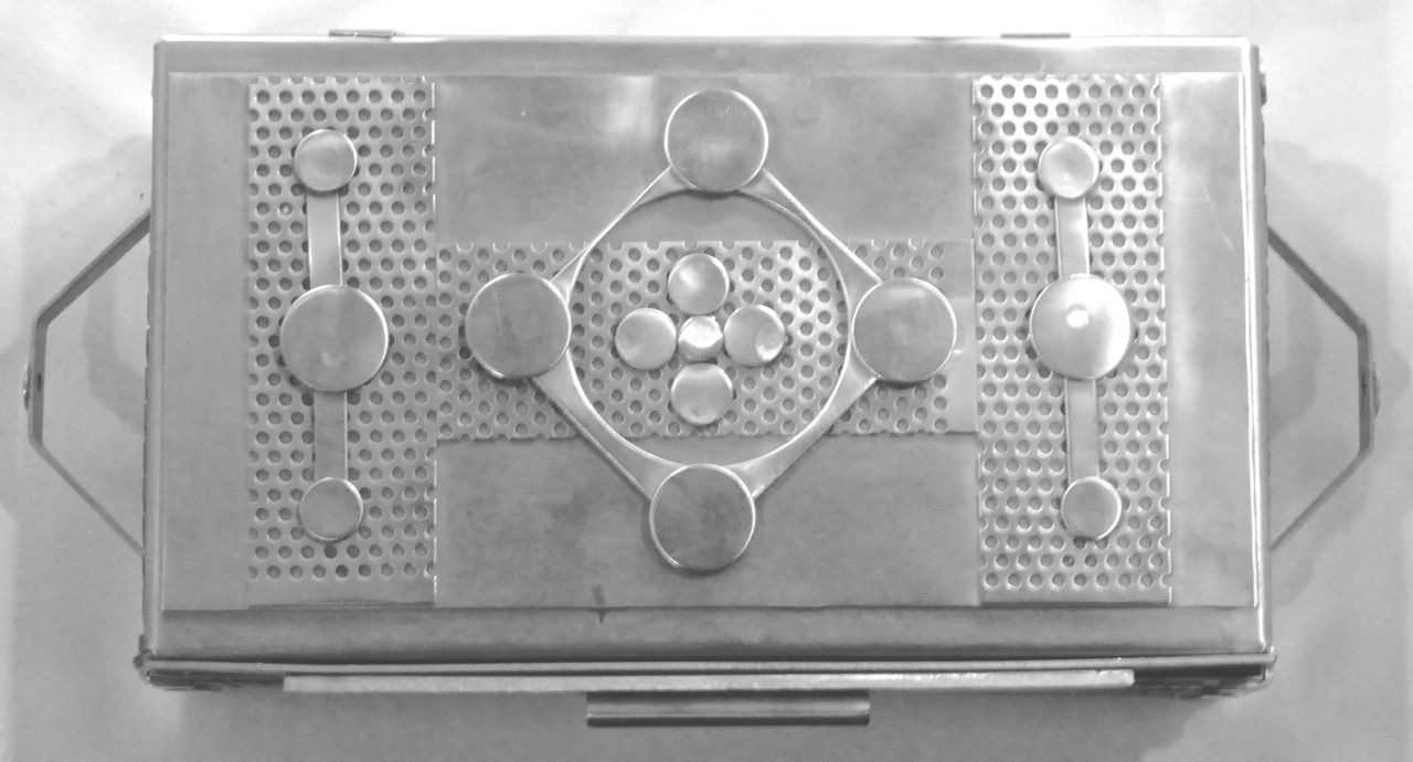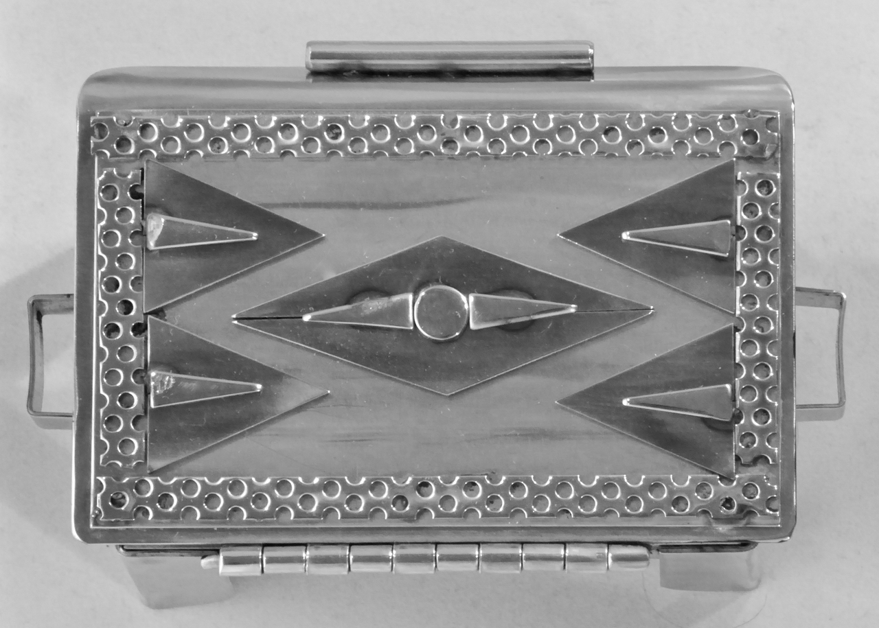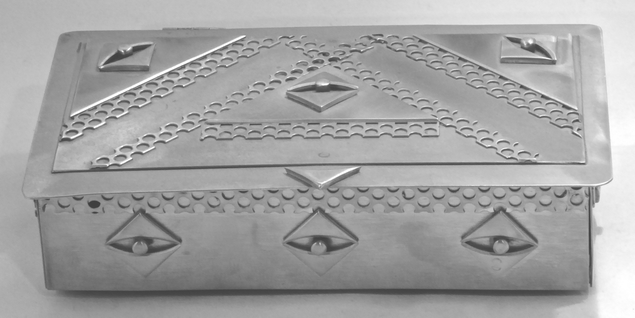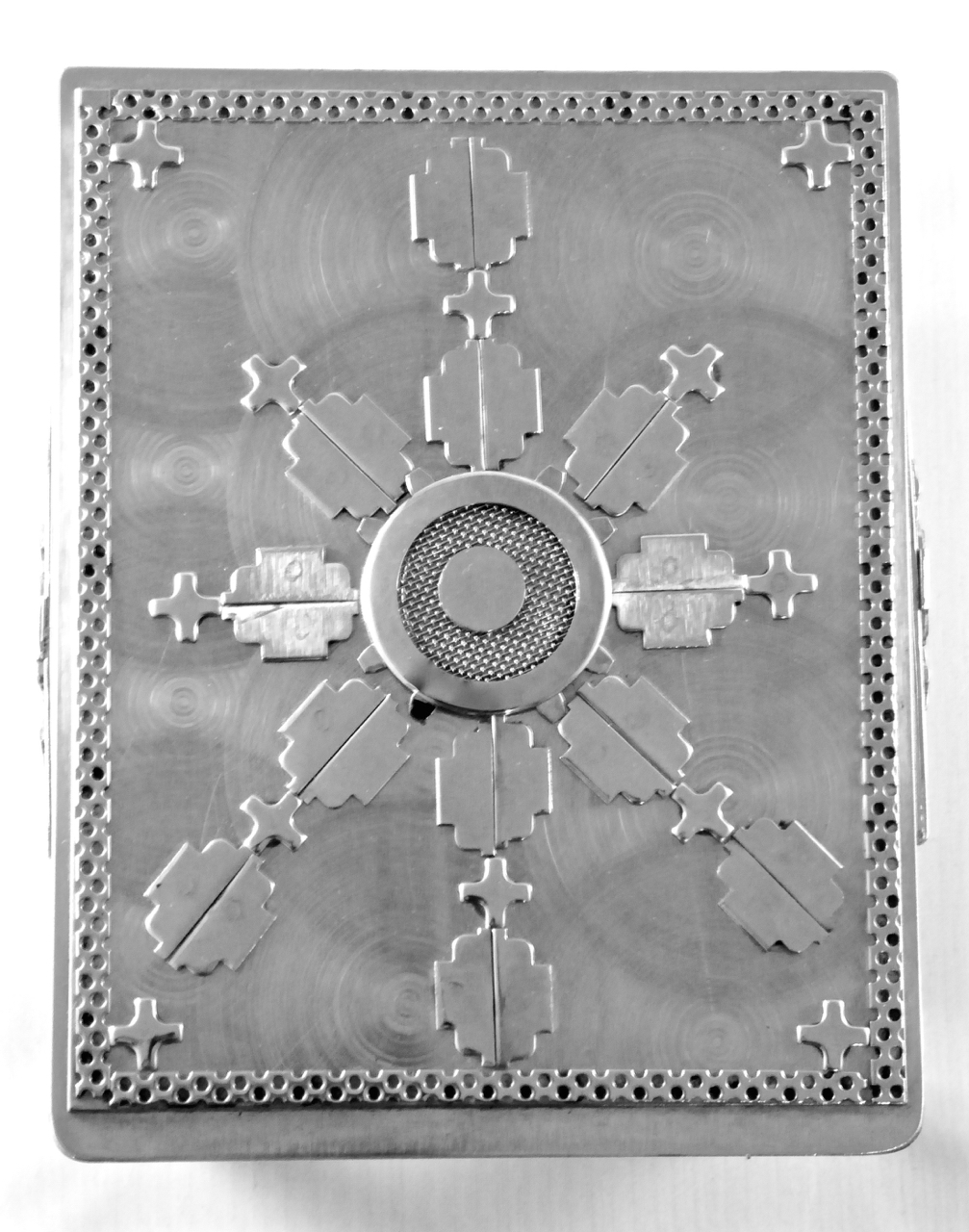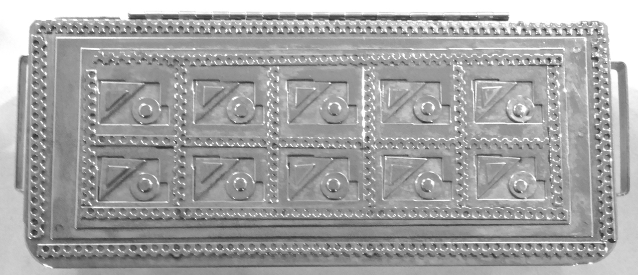 Stanley Szwarc (1928-2011) was a prolific artist, and boxes were his most frequent creation. There are thousands of these floating around the Chicago area, ranging from tiny ones barely a couple of inches wide to bruisers that could take up the corner of a desk. In his basement were closets and trunks filled with layers of boxes stacked up and divided by sheets of cardboard. “No two alike,” he would always say. As with all his work, the ornamentation is brilliantly creative.