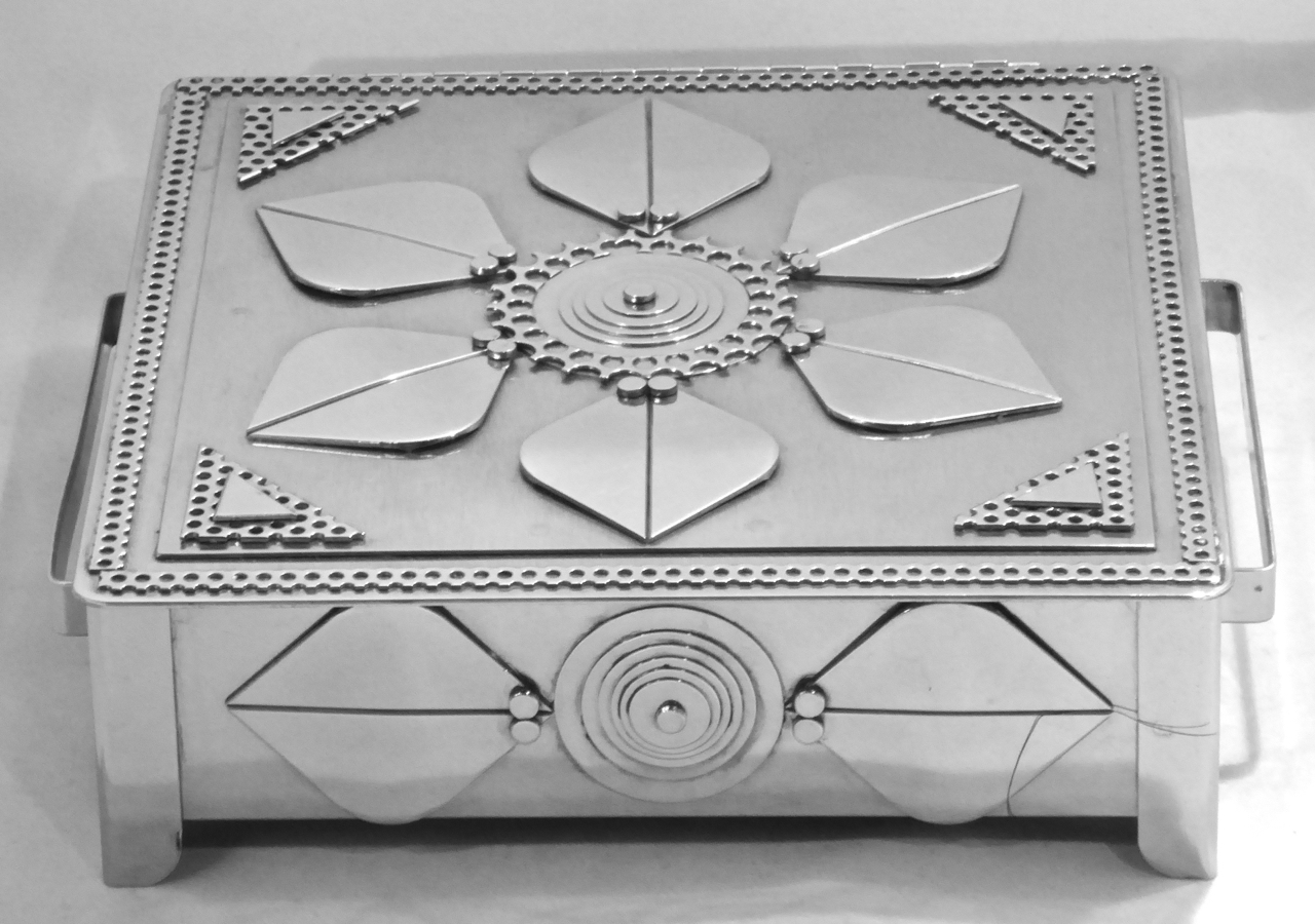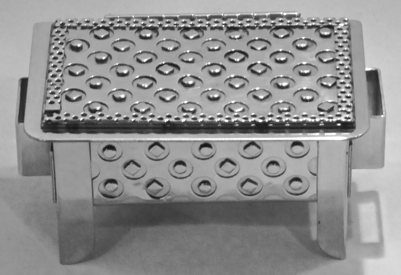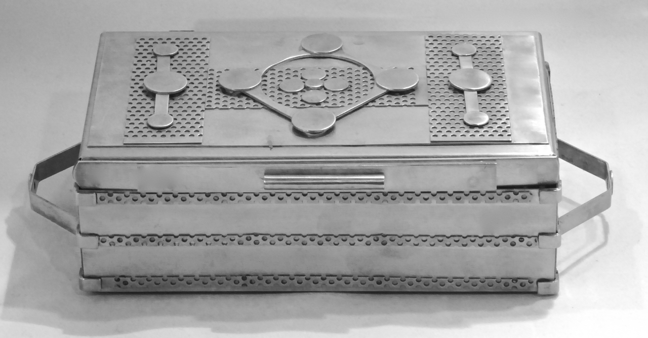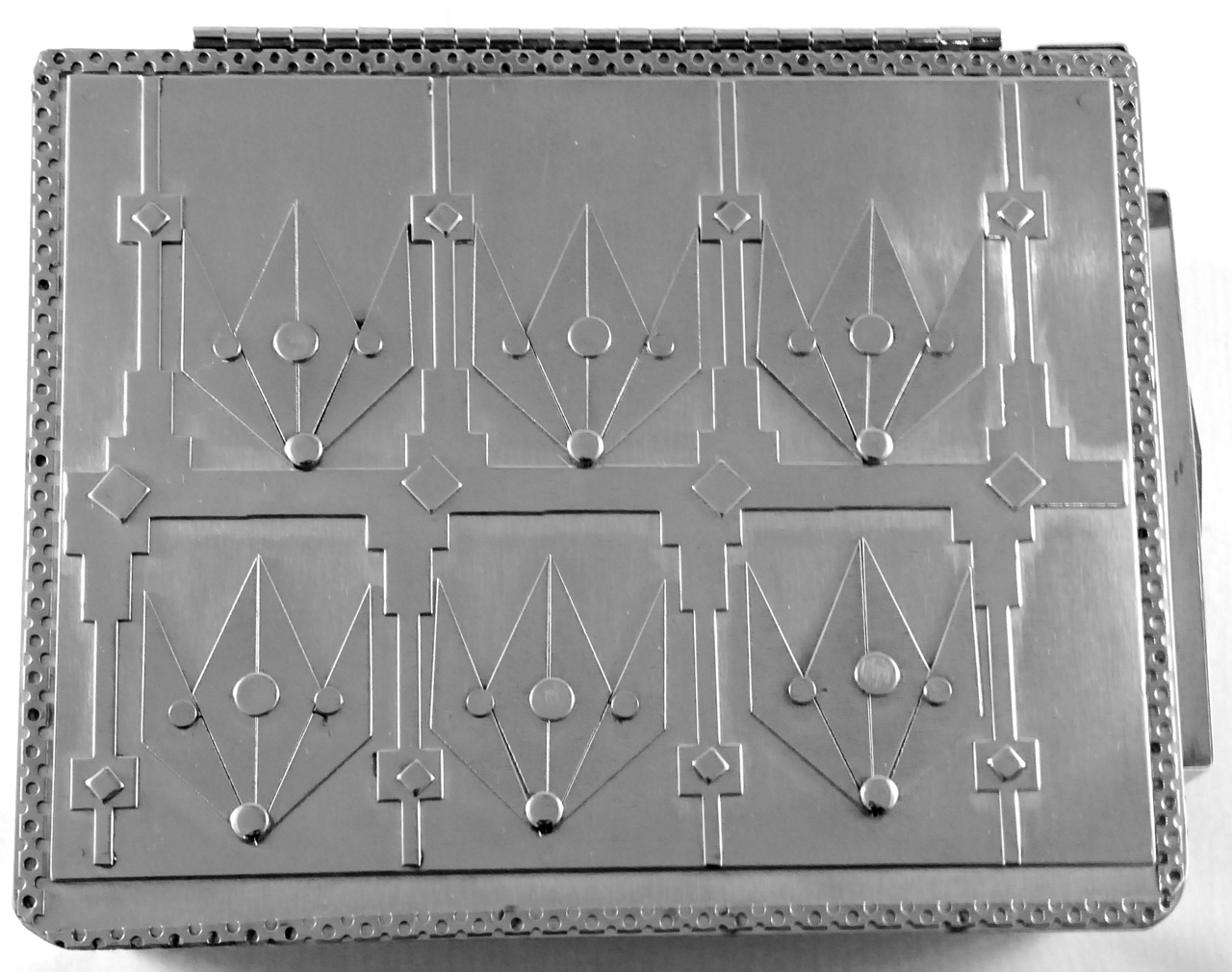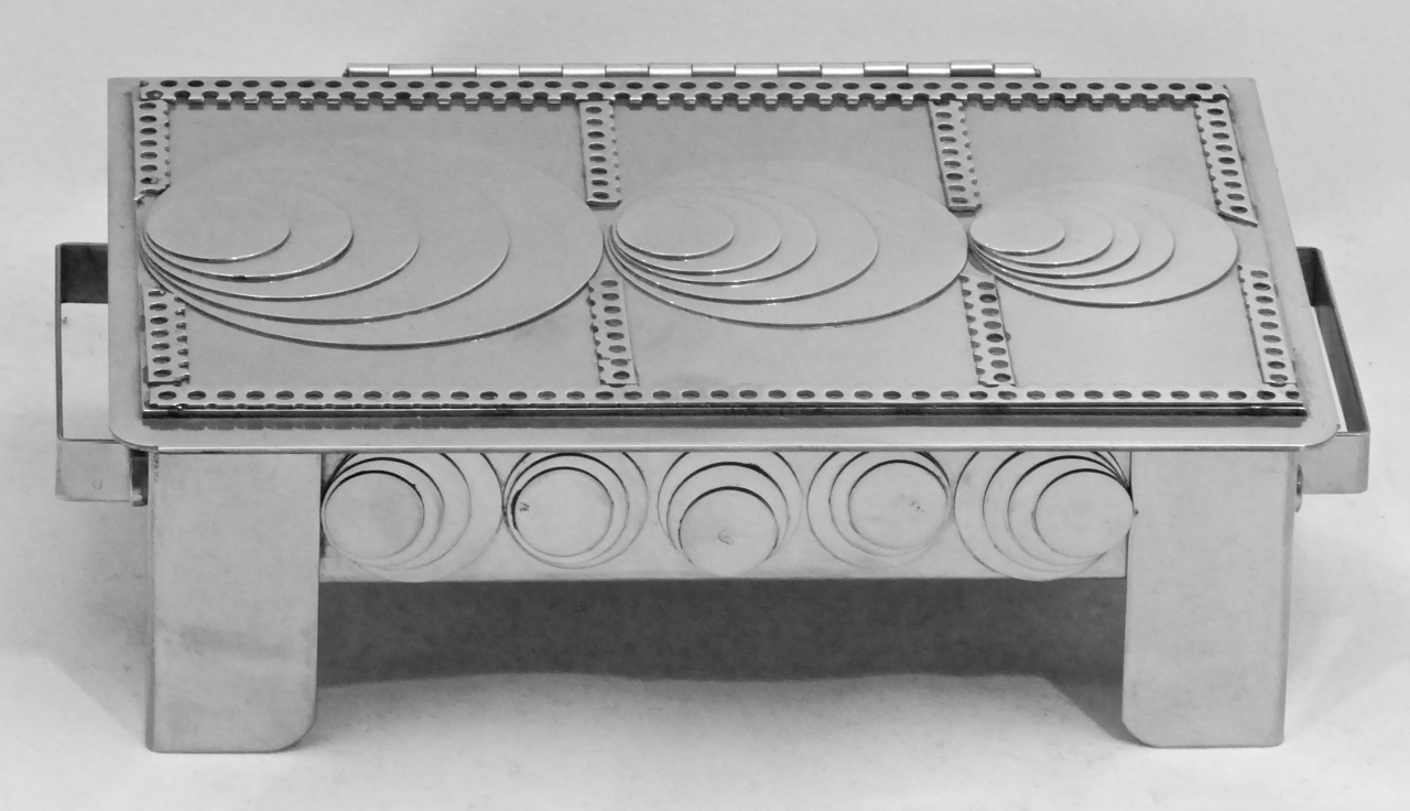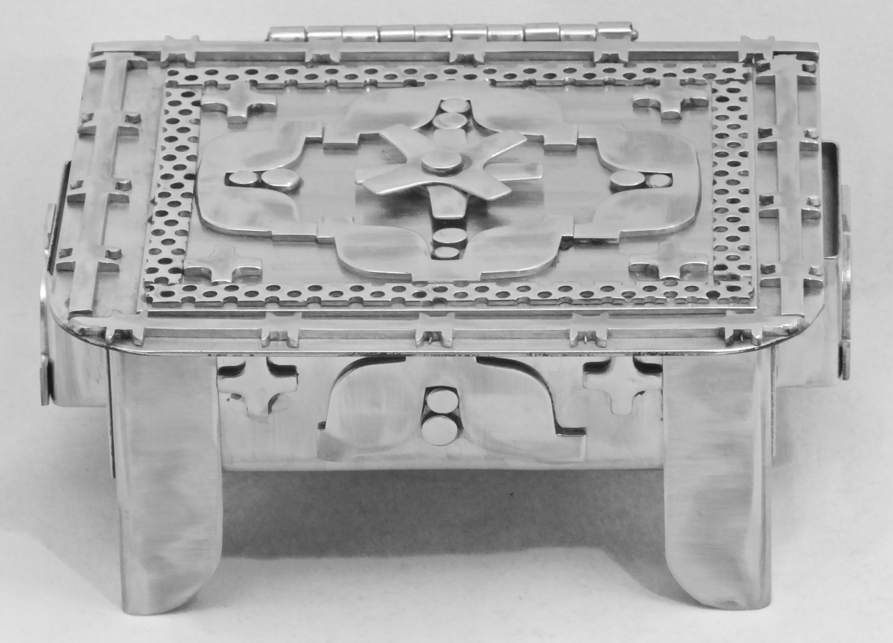Stanley Szwarc (1928-2011) was a prolific artist, and boxes were his most frequent creation. There are thousands of these floating around the Chicago area, ranging from tiny ones barely a couple of inches wide to bruisers that could take up the corner of a desk. In his basement were closets and trunks filled with layers of boxes stacked up and divided by sheets of cardboard. “No two alike,” he would always say. As with all his work, the ornamentation is brilliantly creative.