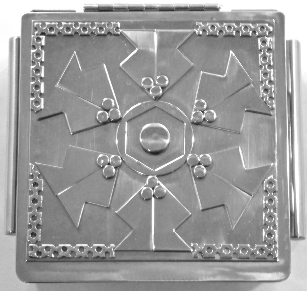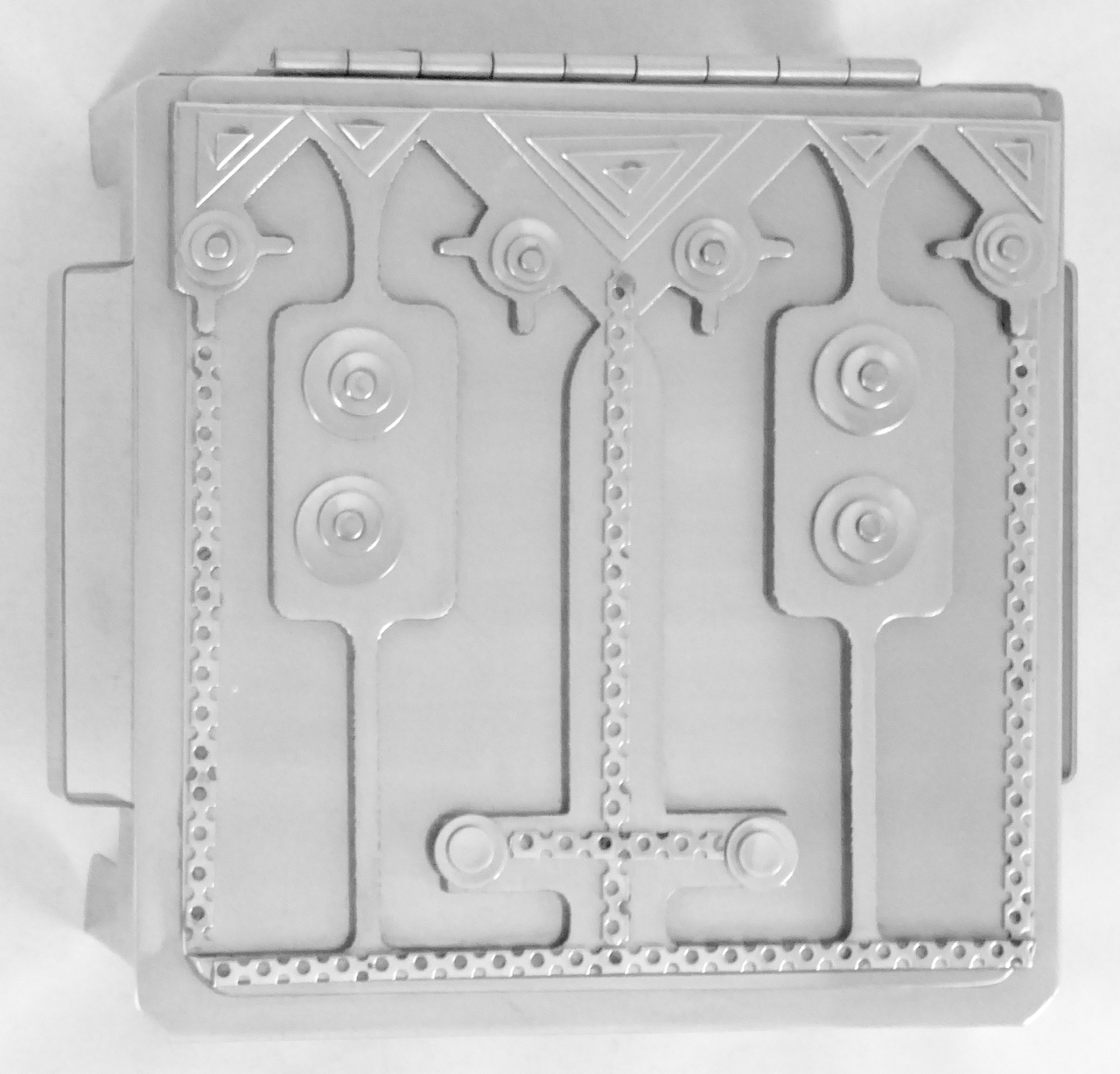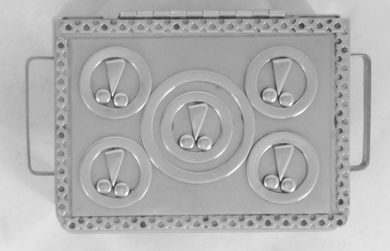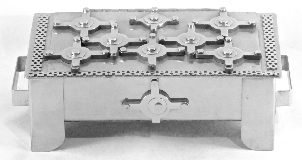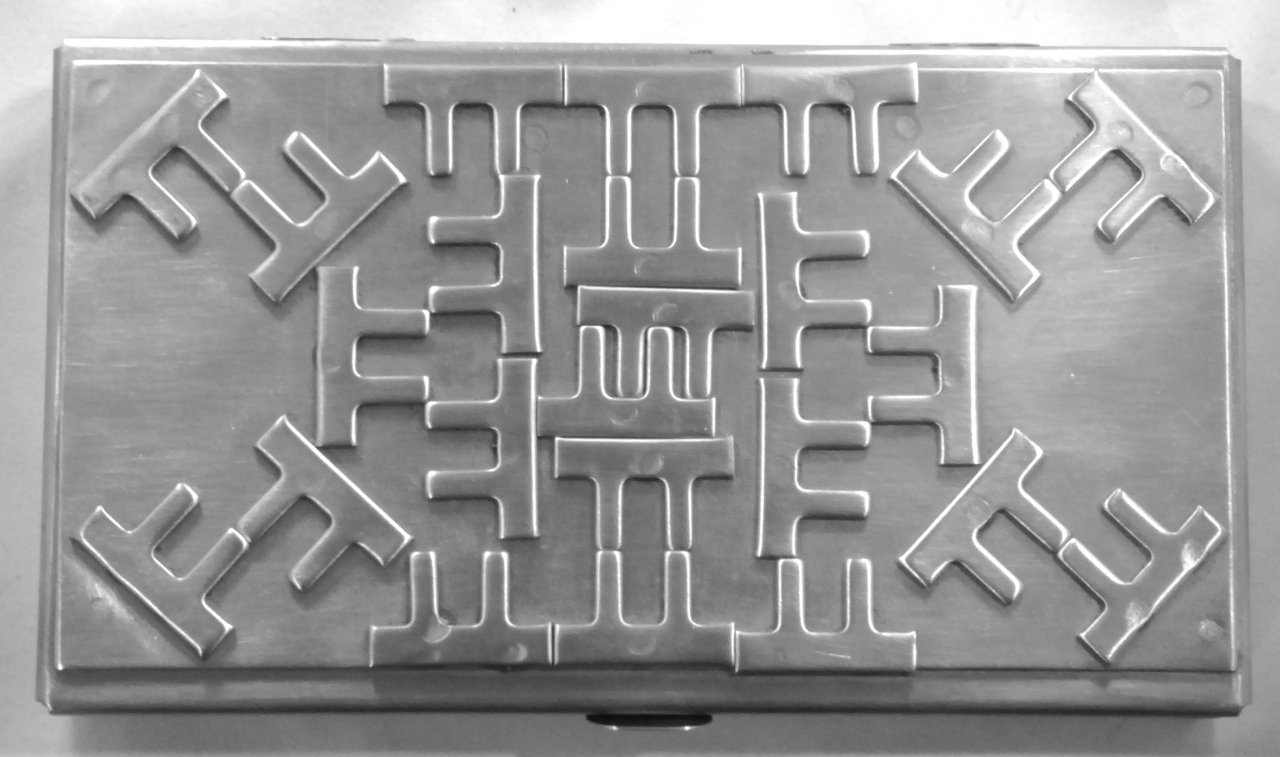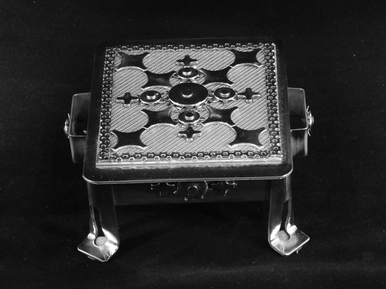Stanley Szwarc (1928-2011) was a prolific artist, and boxes were his most frequent creation. There are thousands of these floating around the Chicago area, ranging from tiny ones barely a couple of inches wide to bruisers that could take up the corner of a desk. In his basement were closets and trunks filled with layers of boxes stacked up and divided by sheets of cardboard. “No two alike,” he would always say. As with all his work, the ornamentation is brilliantly creative.