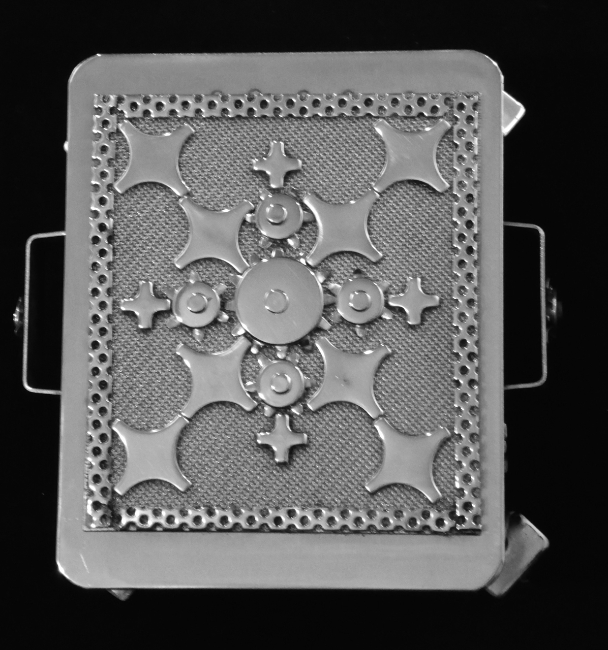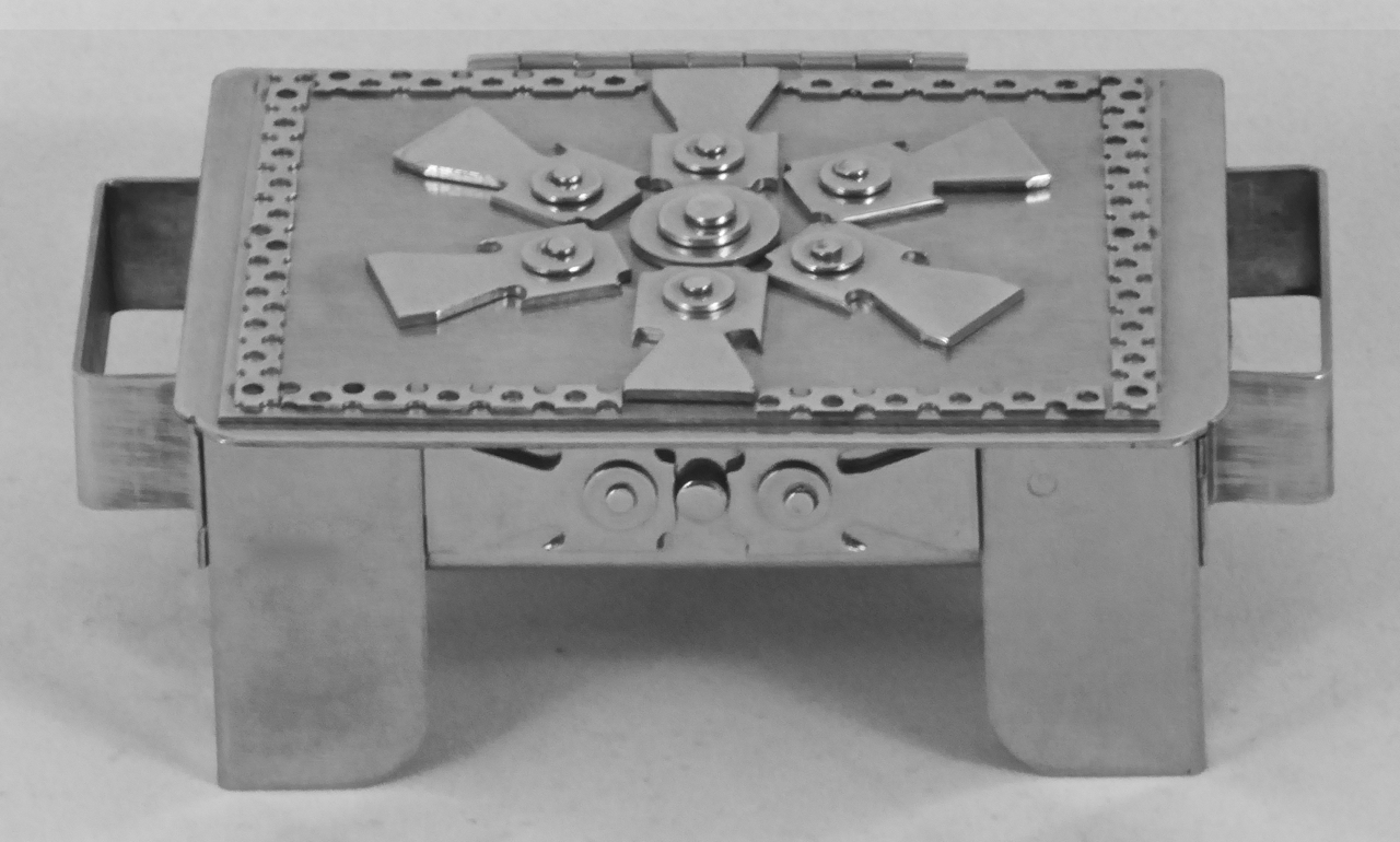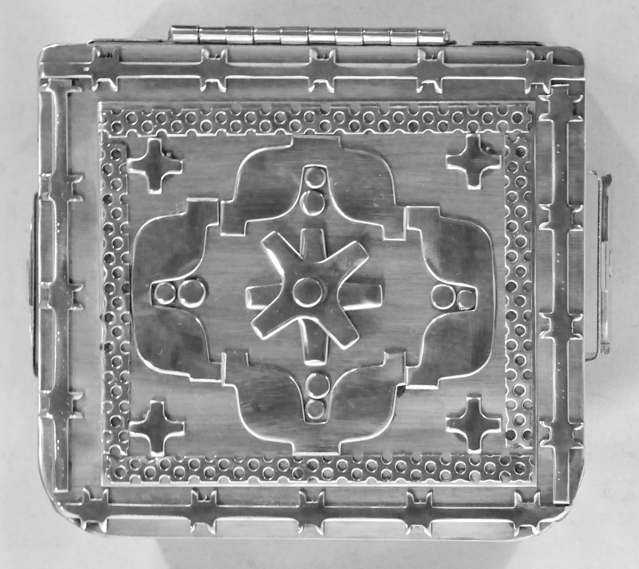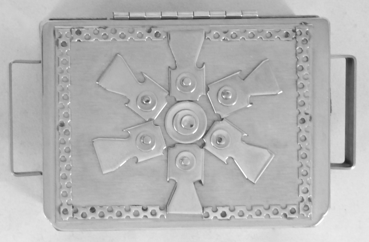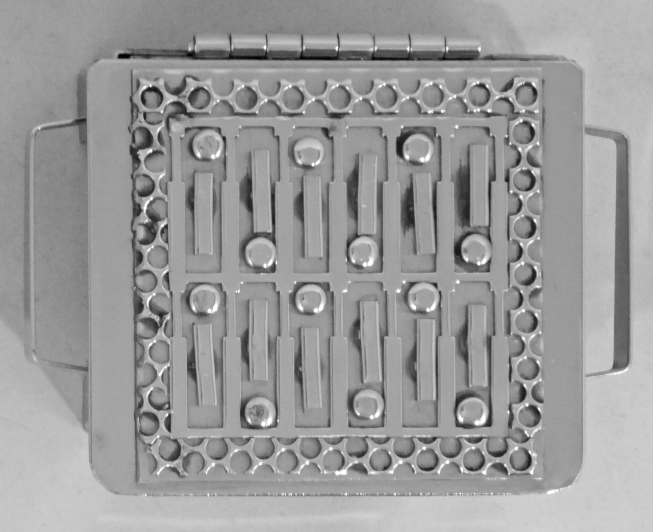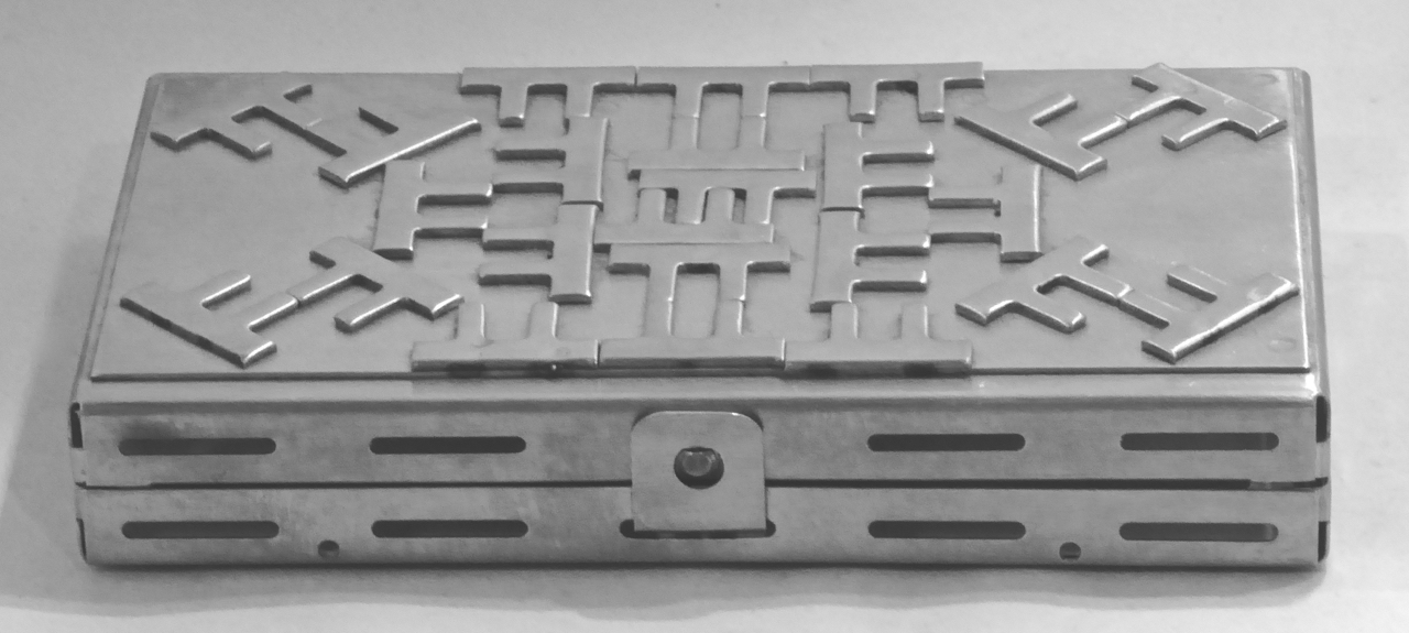 Stanley Szwarc (1928-2011) was a prolific artist, and boxes were his most frequent creation. There are thousands of these floating around the Chicago area, ranging from tiny ones barely a couple of inches wide to bruisers that could take up the corner of a desk. In his basement were closets and trunks filled with layers of boxes stacked up and divided by sheets of cardboard. “No two alike,” he would always say. As with all his work, the ornamentation is brilliantly creative.