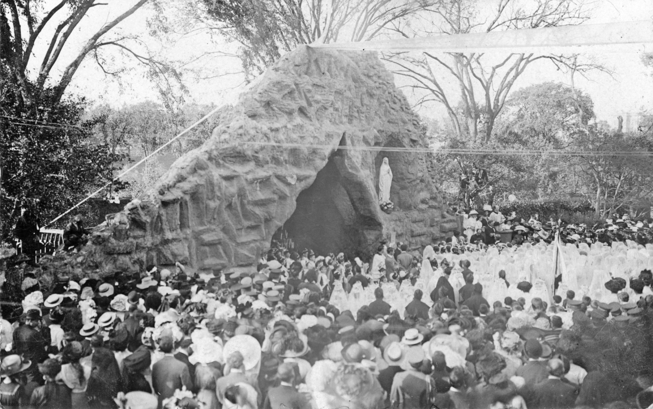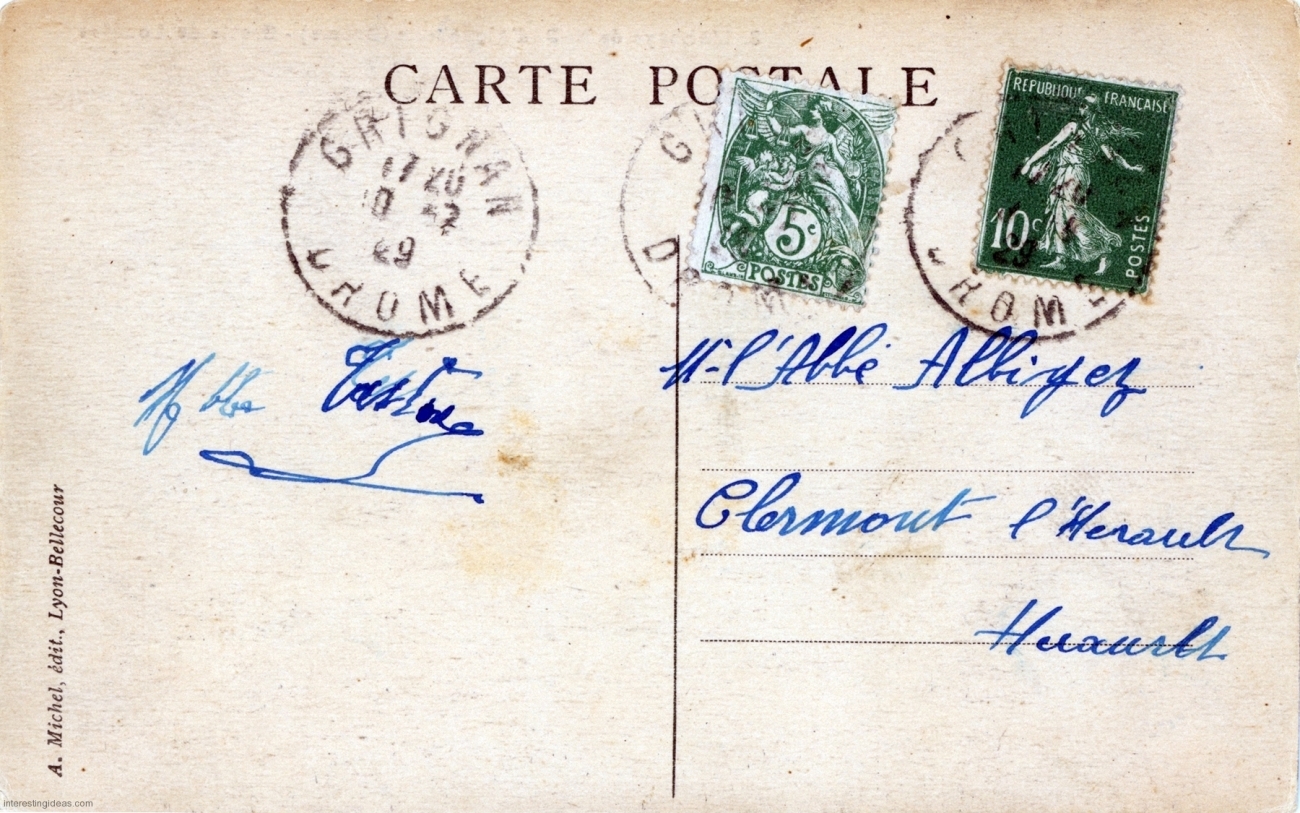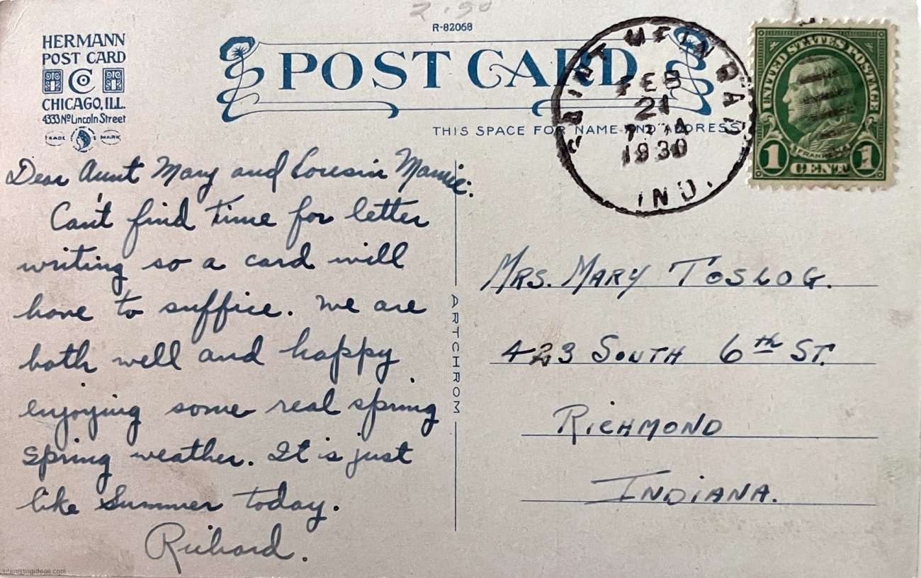 The galleries include the backs of cards when they contain even modestly relevant information. Many just reference the weather and travel plans. But some are more interesting, like the one referring to the “bum” responsible for a mud sculpture of the crucifixion, and many are useful in dating the postcard.