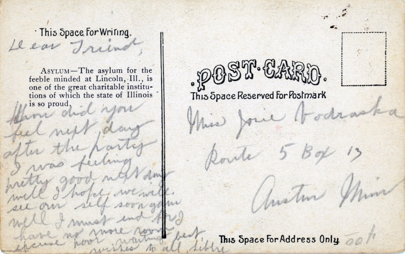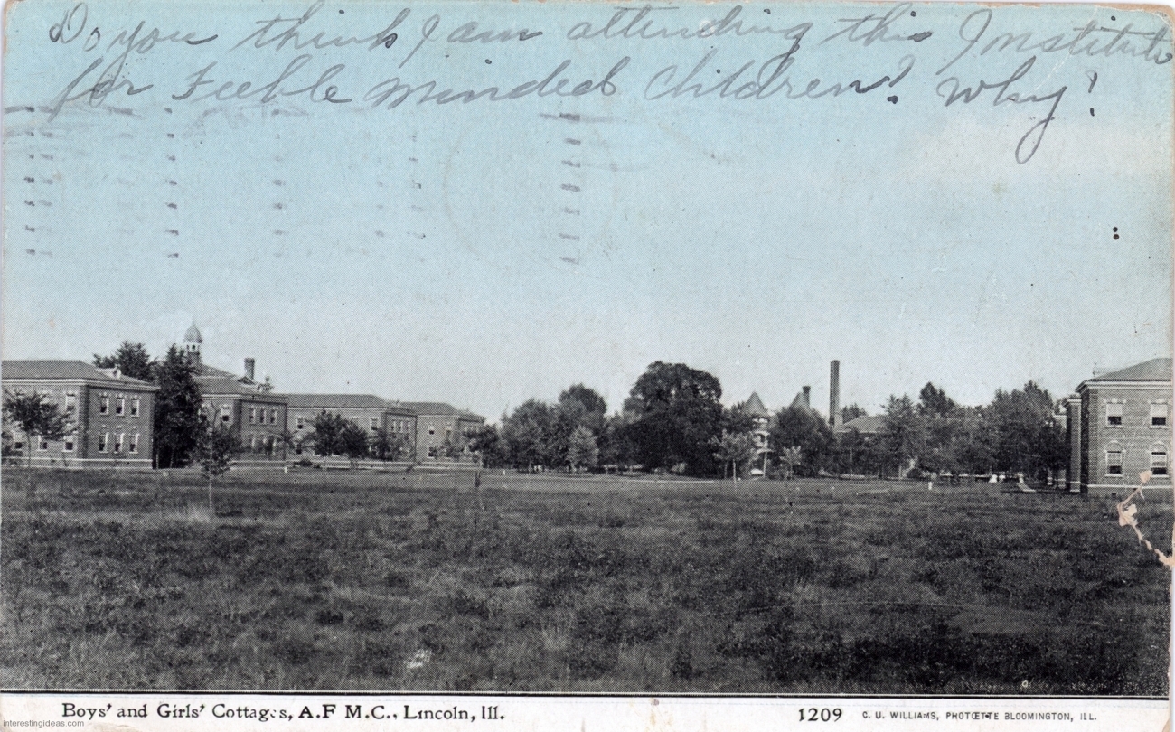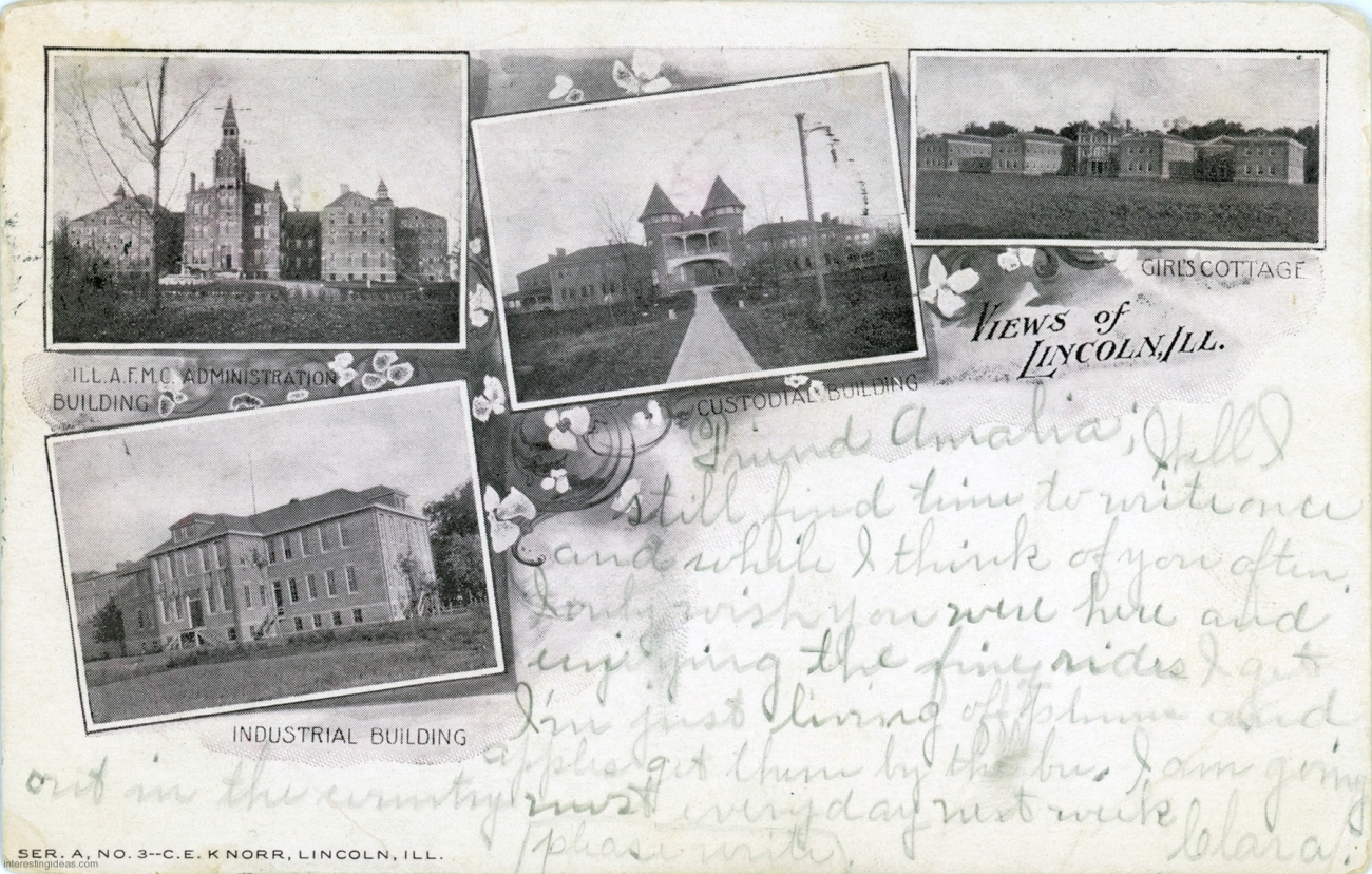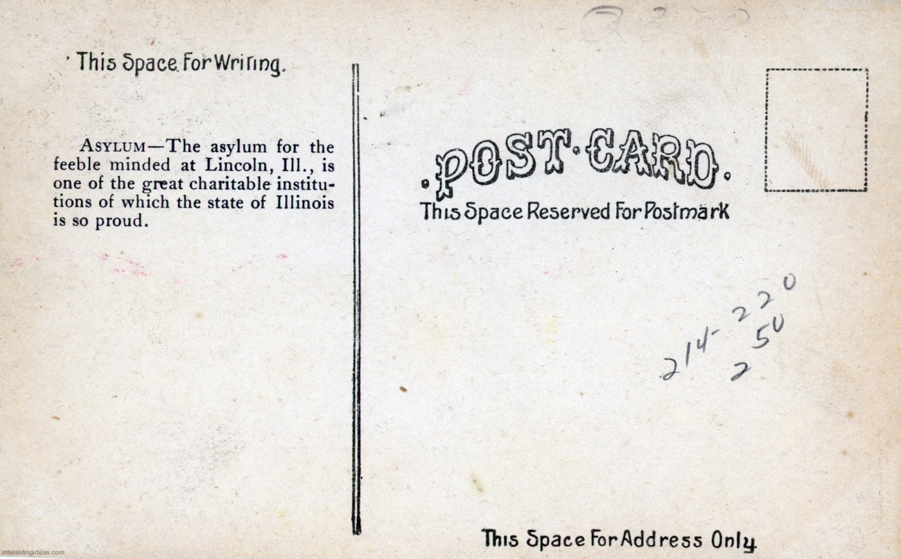This page presents a digitized library of these postcards, as well as some related snapshots and brochures. There’s also a bonus gallery of postcards showing the Asylum for Feeble-Minded Children in Lincoln, Illinois, the one-time residence of Henry Darger. Plus my own collection of vintage images of Miami’s magnificent Bottle Cap Inn environment.