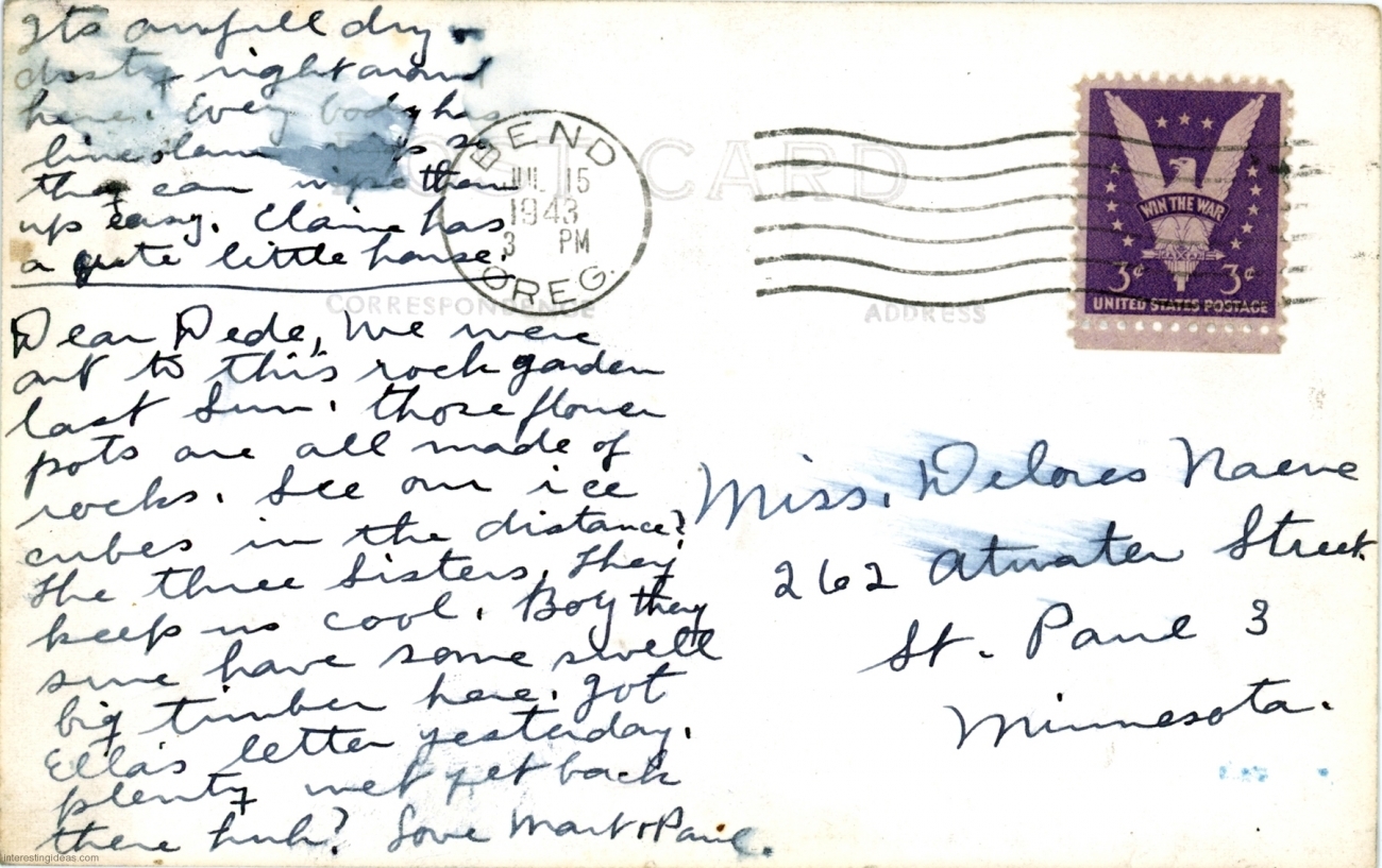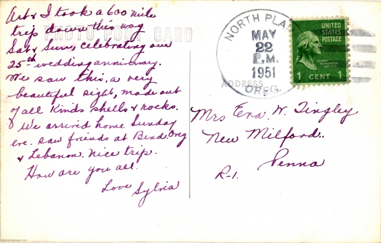 The galleries include the backs of cards when they contain even modestly relevant information. Many just reference the weather and travel plans. But some are more interesting, like the one referring to the “bum” responsible for a mud sculpture of the crucifixion, and many are useful in dating the postcard.
