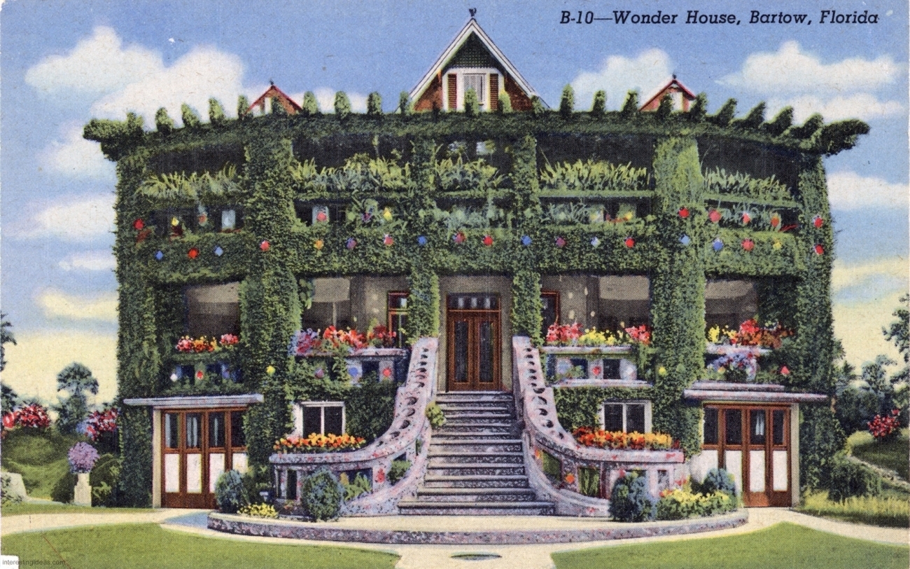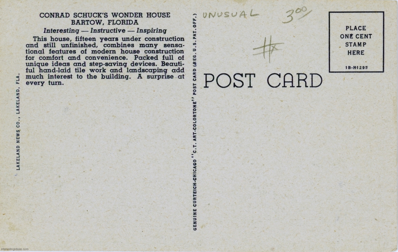 This page presents a digitized library of these postcards, as well as some related snapshots and brochures. There’s also a bonus gallery of postcards showing the Asylum for Feeble-Minded Children in Lincoln, Illinois, the one-time residence of Henry Darger. Plus my own collection of vintage images of Miami’s magnificent Bottle Cap Inn environment.